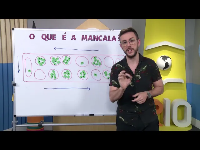 E aí [Música] o Olá sejam muito bem-vindos a mais uma aula de matemática eu sou professor Gabriel Cacau E hoje vamos falar sobre mancala Você sabe o que é isso bom o título nossa aula era o que é a mancala mancala é uma série de Jogos cujas regras são bem semelhantes e Originalmente esses jogos que surgiram na África eles eram jogados com semente e as sementes eram colocadas na terra isso mesmo os jogadores eles cavavam buracos na terra e colocavam essas sementes nesses buracos Por isso as jogadas da mancala são chamadas de semeadura Pois quando você faz uma jogada quando você movimenta uma semente você está Semeando Então os movimentos se chamam cm e esse jogo se popularizou na África como um todo e por esse motivo existem diversas variações na aula de hoje nós vamos ver uma dessas variações no entanto existem diversas outras regras de um jogo chamado mancala tudo bem bom esse jogos chamados mancala também são considerados jogos de Contagem e captura bom são jogos de Contagem hoje quando movimentamos as sementes nós contamos as semente e captura pois nós vamos capturar as sementes do nosso oponente importante vamos entender como funciona o tabuleiro da mancala bom nós temos aqui um tabuleiro feito de madeira perceba que temos 12 buracos ou cavidades de mesmo tamanho 16 cavidades ficam viradas para o lado de um jogador e as outras seis ficam viradas para o lado de outro jogador perceba que também temos duas outras cavidades maiores essas duas cavidades maiores nós chamamos de Oasis e são nos Oasis que os jogadores. O bom se eu estou desse lado do Tabuleiro e o ponto no meu oásis a minha direita e o oponente vai pontuar no Asus que está à direita dele e obviamente a minha esquerda bom aqui no quadro eu representei um tabuleiro através de um desenho bom Estão aqui as 6 cavidades do jogador que está embaixo e as 6 cavidades no jogador que está em cima Esse Oásis corresponde ao jogador de baixo e esse Oásis corresponde ao jogador de cima e vamos agora montar o tabuleiro nós começamos distribuindo 4 sementes que estão representados por esses desenhos e verdes em cada um uma das cavidades de mesmo tamanho então Inicialmente nós distribuímos 4 sementes 4 sementes quadro sementes e assim por diante apenas nas cavidades de mesmo tamanho Bom vamos lá uma primeira pergunta a matemática nós temos quatro sementes em quantas cavidades uma duas três quatro cinco seis 6 x 2 né já que temos dois jogadores 12 então nós temos 4 x 12 sementes certo e osso da isso mesmo 48 sementes o jogo começa com 48 sementes distribuídos a 12 cavidades bom vamos agora simular algumas jogadas para a gente entender como funciona o jogo mancala pó escolhe se quem vai ser o primeiro jogador Vamos considerar que eu vou começar com um jogador de Baixo tudo bem para vocês então jogador de baixo vai escolher uma das casas uma das cavidades para distribuir as sementes bom Digamos que o jogador de baixo escolha essa casa daquilo tudo bem para vocês então ele retira todas as sementes dessa casa e vai distribuir essas semente nas casas à direita e vocês observa em as setinhas vai funcionar no sentido anti-horário e como uma um movimento circular ou seja é uma semente eu coloco nessa casa já que eu tirei dessa eu começa colocando nessa a outra semente eu coloco no meu oásis isso mesmo eu fiz um ponto né já que no oasis é que eu vou contar a minha pontuação e vou continuar distribuindo inclusive no lado do meu adversário bom e agora é a vez o meu oponente ele vai escolher uma casa para jogar um Digamos que o meu oponente escolha essa casa aqui essa casa em que ele vai retirar as quatro sementes e vai distribuir hoje uma casa a sua direita sempre o movimento no sentido anti-horário ou seja a direita do meu oponente Agora é a vez do oponente de cima lembrando bom então ele pega uma semente e coloca nesta casa uma semente nesta casa uma semente nesta casa e uma semente no próprio Oasis a importante quando a última semente da jogada cai no próprio Ases do jogador que foi o caso agora do jogador de cima o jogador tem direito a fazer uma nova jogada então grava isso se a última semente quando for distribuída cair no seu próprio Aziz o jogador tem direito a fazer uma nova jogada então o jogador de cima vai escolher uma outra casa para fazer a jogada Digamos que ele escolha essa casa bom agora ele vai retirar todas as sementes dessa casa desta cavidade e e lembrando novamente sempre no sentido anti-horário ou seja na direita tudo bem Vamos distribuir estava aqui então uma semente para cá uma semente para cá uma semente para cá uma semente para cá uma semente para cá e não aconteceu nada de especial então é a vez do jogador de baixo vamos a uma nova regra por enquanto nós sabemos que quando a última semente cai no seu próprio Aziz o jogador tem direito a fazer uma nova jogada agora nós vamos ver como que capturamos as sementes do nosso adversário vamos lá Imagine que o jogador de baixo escolha essa cavidade para jogar então ele retira essas quatro sementes o distribui Lembrando que sempre para o lado direito então ele vai distribuir uma aqui uma aqui uma aqui e a última caiu em uma casa vazia Será que isso é uma jogada especial o quê que vocês acham que acontece quando a sua última semente na jogada cai em uma casa vazia isso mesmo você pode capturar todas as sementes do seu adversário que estiverem na frente desta casa ou seja quando o jogador joga e a última semente da jogada cai numa casa vazia como foi este caso ele tem direito a capturar todas as sementes do adversário que estiverem na frente E essas sementes vão para onde onde o que nós fomos vamos nesse jogo no oasis futebol então aqui eu estou com com sete pontos um dois três quatro cinco seis sete pontos e o meu adversário né o jogador de cima ainda está com apenas um ponto aí vocês podem me perguntar se eu ponto Ei eu faço uma nova jogada não você só faz um