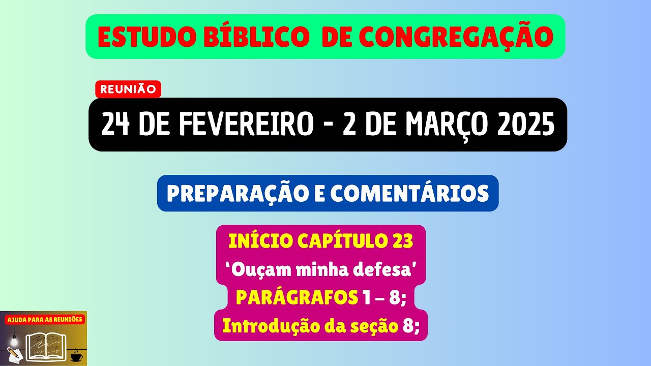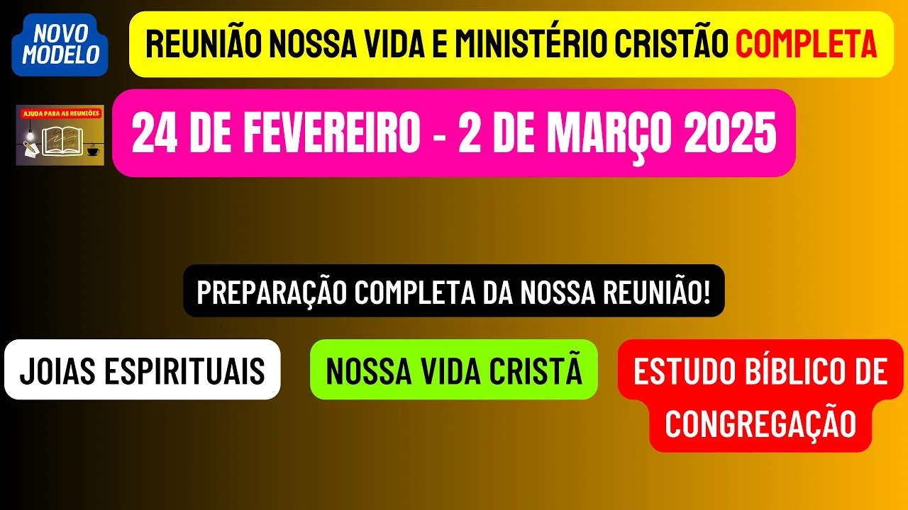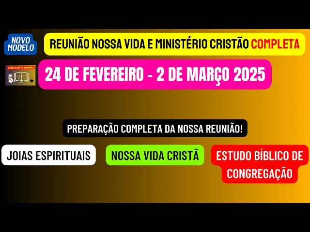 sejam todos muito bem-vindos ao nosso canal ajuda para as reuniões Esperamos que Jeová esteja com cada um de vocês queridos irmãos e queridos irmãs e neste vídeo nós vamos estar disponibilizando como de costume a reunião nossa vida e Ministério Cristão completa desta semana 24 de Fevereiro a 2 de março de maneira objetiva de maneira objetiva nós vamos analisar e preparar as partes principais dessa reunião que são aquelas perguntas e respostas então iniciando nós vamos preparar as joias espirituais que podemos encontrar na leitura da Bíblia desta semana que se baseia no texto de provérbios Capítulo 2