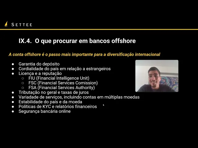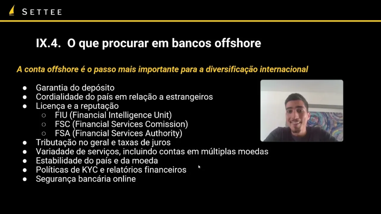 Olá sejam bem-vindos à nossa aula número 2 do módulo número 9 sobre bancos e compliance hoje a gente vai falar sobre o que procurar em bancos of Store e também sobre os mecanismos de troca de informações primeiramente o que buscar em bancos offline é uma conta of Store é um passo importantíssimo para sua diversificação internacional e por isso é importante a gente parar e pensar o que que a gente realmente está buscando para esse tipo de conta Então primeiramente um ponto que pode ser considerado a questão de garantia de depósito quanto de garantia de depósito