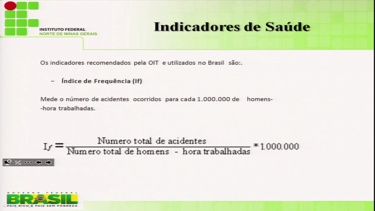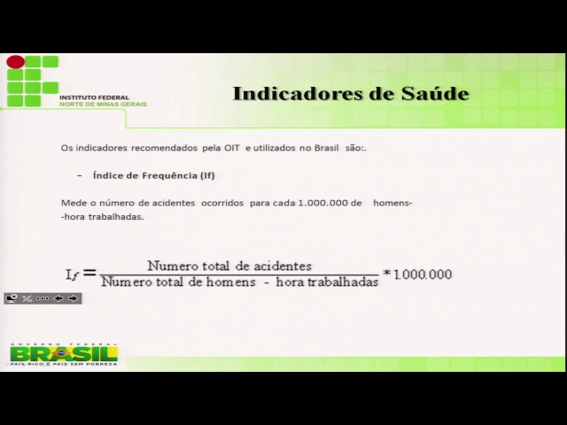 de cuidar de segurança e dignidade é a única das agências nos sistemas nações unidas com uma estrutura tripartite composta de representantes de governo e de organizações de empregadores e trabalhadores vamos visualizar pelos light nós teremos indicadores que são recomendados pela oit e utilizados no brasil ok ok aí nós temos então indicadores de saúde que os indicadores recomendados pelo iti e utilizados no brasil são o índice de freqüência este aí você vai visualizar que ele mede o número de acidentes ocorridos para cada 1 milhão de homens horas trabalhadas nesse caso aí é refere se ao número