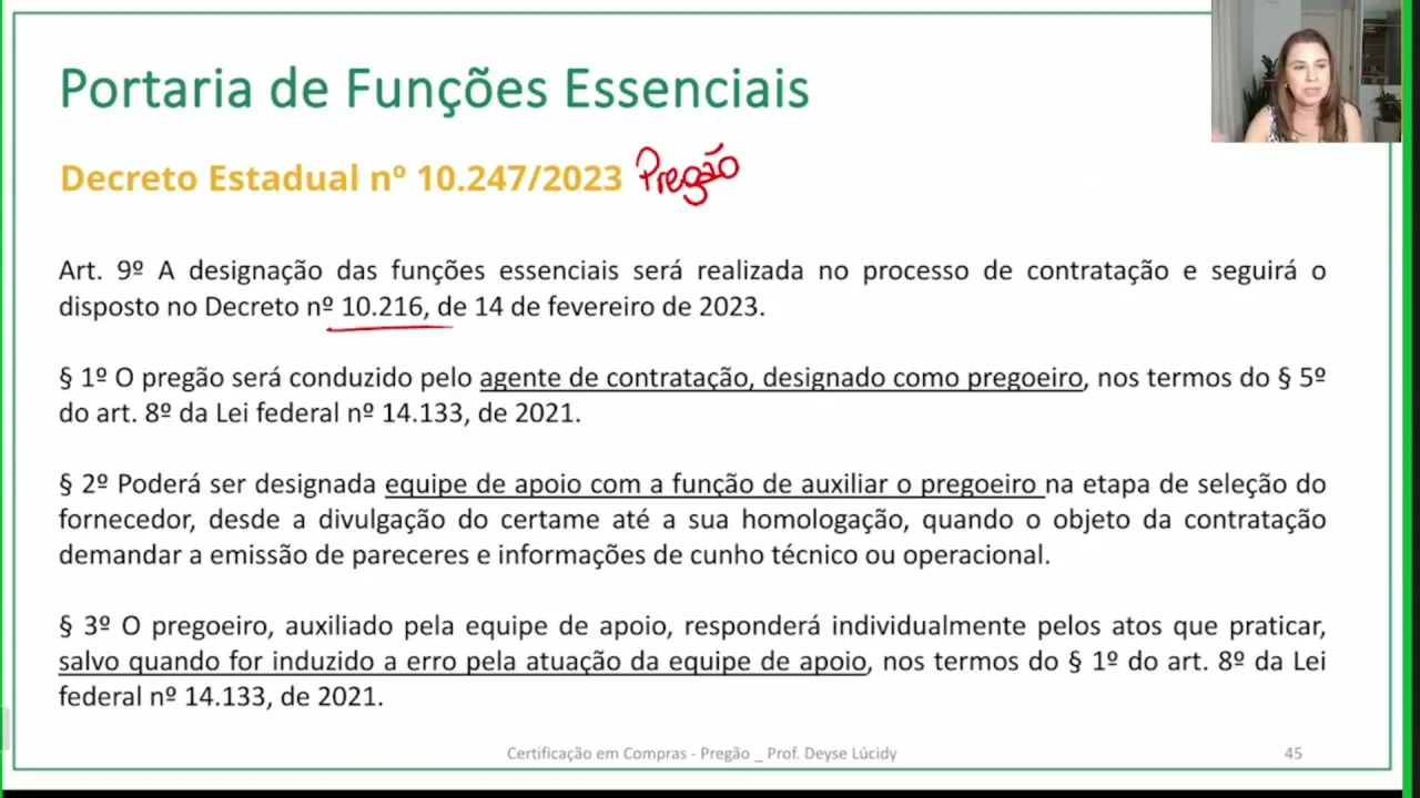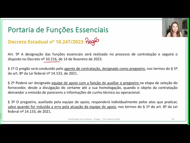 aconteceu alguma coisa mas sempre que possível tentem trabalhar para que o de contratação acompanha o processo desde o início e vá com o processo até o final né isso daí vai dar maior segurança o processo vai ficar de uma forma melhor instruído bem gente o que que nós temos aí sobre essas portarias de funções essenciais o decreto 10.247 é o Decreto que trata da regulamentação do pregão no âmbito Estadual diz que a designação das funções essenciais no processo de contratação seguirá o Decreto 10216 que é o Decreto que trata das funções essenciais e diz que