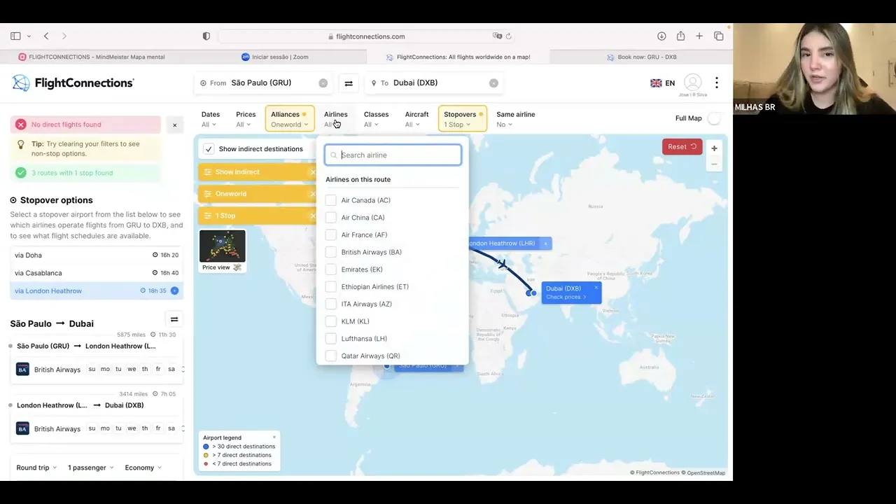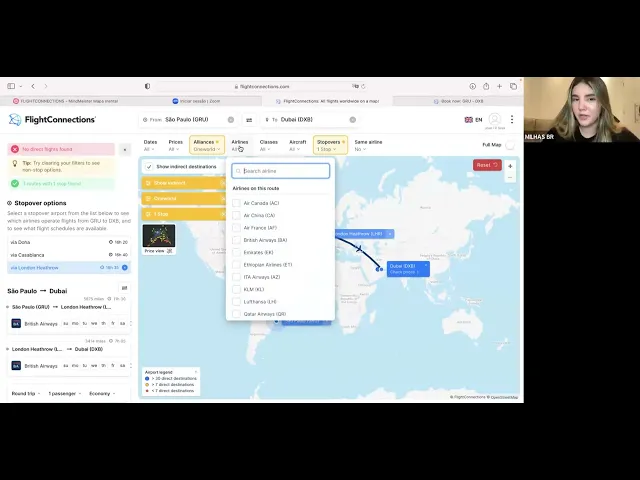 Oi eu sou a Niz e a aula de hoje é uma aula prática sobre o Fly connections e eu vou mostrar aqui para vocês um exemplo de Guarulhos saindo de Guarulhos São Paulo para Dubai dxb a minha versão aqui do F connections ela é paga então vou conseguir mostrar para você todos os filtros aqui sem contar que a gente tá trabalhando com o layout de uma ferramenta bem interativa Então vai ser mais fácil para entender aqui visualizar já de início já de primeira eu consigo identificar um voo direto sem escala de São Paulo para Dubai