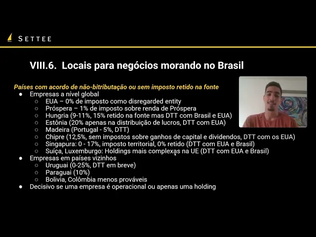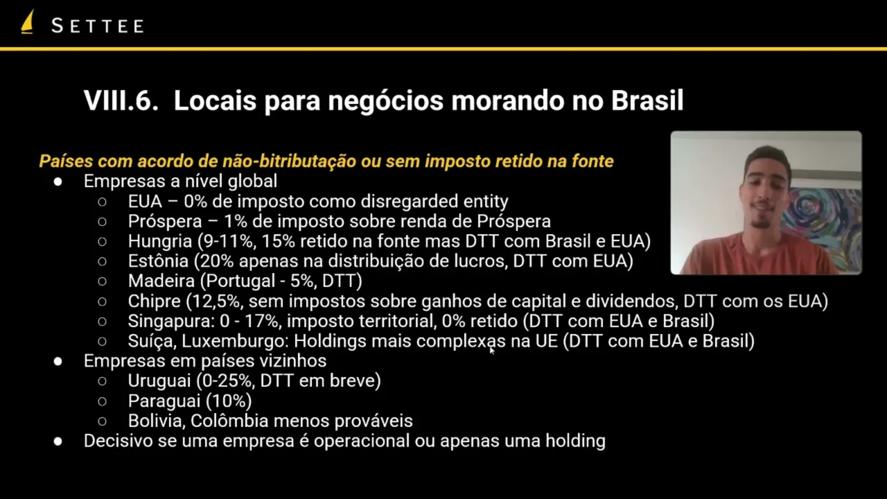 brasileiras têm se mudado para lá Além disso Bolívia e Colômbia podem ser interessantes mas são menos prováveis né Colômbia tem regime de zonas francas com 20% de imposto sobre os lucros e ao mesmo tempo possui também um regime simples só que tem que ser residente na Colômbia né Tem residência lá e tem a Bolívia que tem imposto territorial então renda de Fora evento de impostos também pode servir como uma jurisdição e aqui é importante você tem que sempre se sempre tem considerar se a sua empresa vai ser uma empresa operacional ou apenas uma holding porque