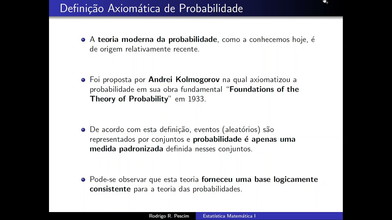 esses aqui da nossa aula de hoje eu espero que vocês entendam bem e tenham clareza sobre o significado dos diversos elementos espaço amostral probabilidade independência nas próximas aulas a gente vai falar de probabilidade condicional Então vamos lá vamos começar o nosso estudo hoje a gente vai ver os axiomas da teoria das probabilidades Quem são as regrinhas que o pessoal declarou que são suficientes para a gente estudar teoria de probabilidade isso é o significado de axioma é um princípio que a gente aceita faz sentido Não é inconsistente eles são consistentes entre si e dali pode se