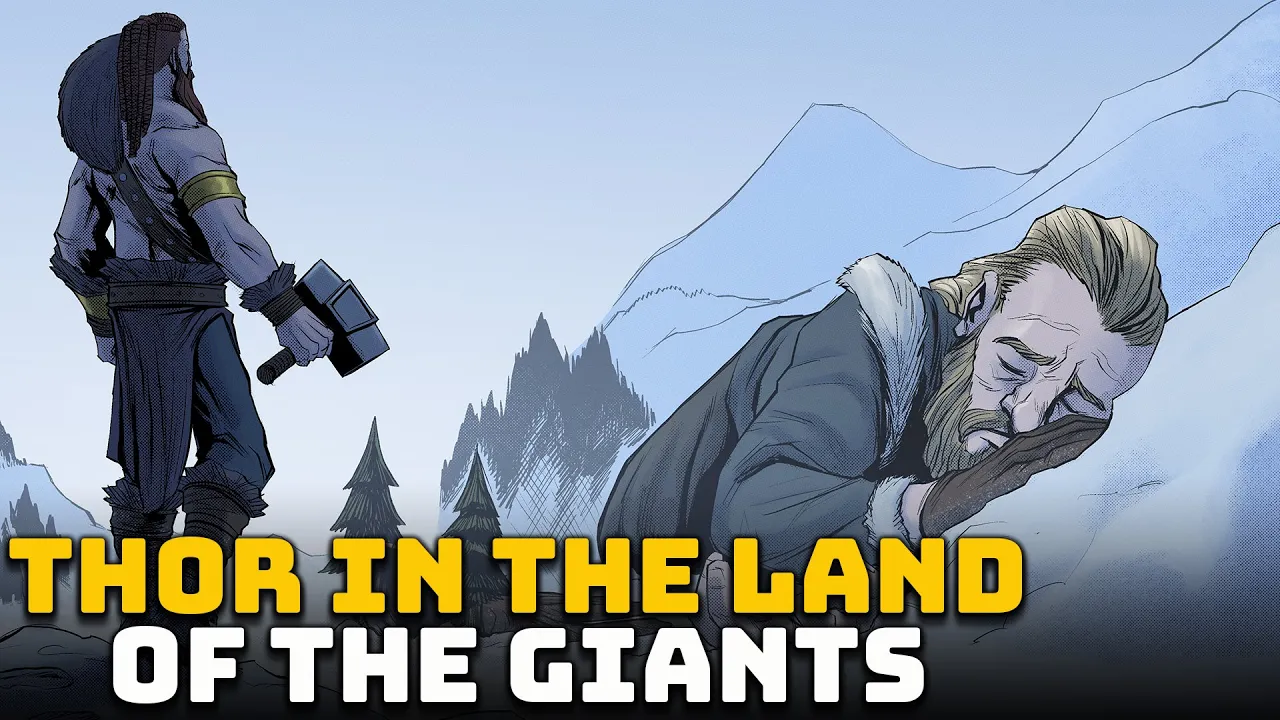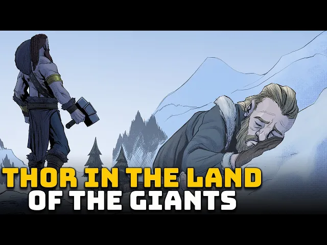 [Music] Thor Loki and his new servant xiaofi roamed through the inhospitable kingdom of yotenheimer the Land of the Giants the intense cold forced them to look for shelter the gods found what appeared to be a huge cave and they went inside the Travelers tried to rest but an immense noise trembled the Earth Thor stepped out of the cave to investigate the source and from the top of a mountain he noticed that a huge giant slept beside their cave and his snoring shook the whole ground the giant woke up and he did not appear particularly threatful