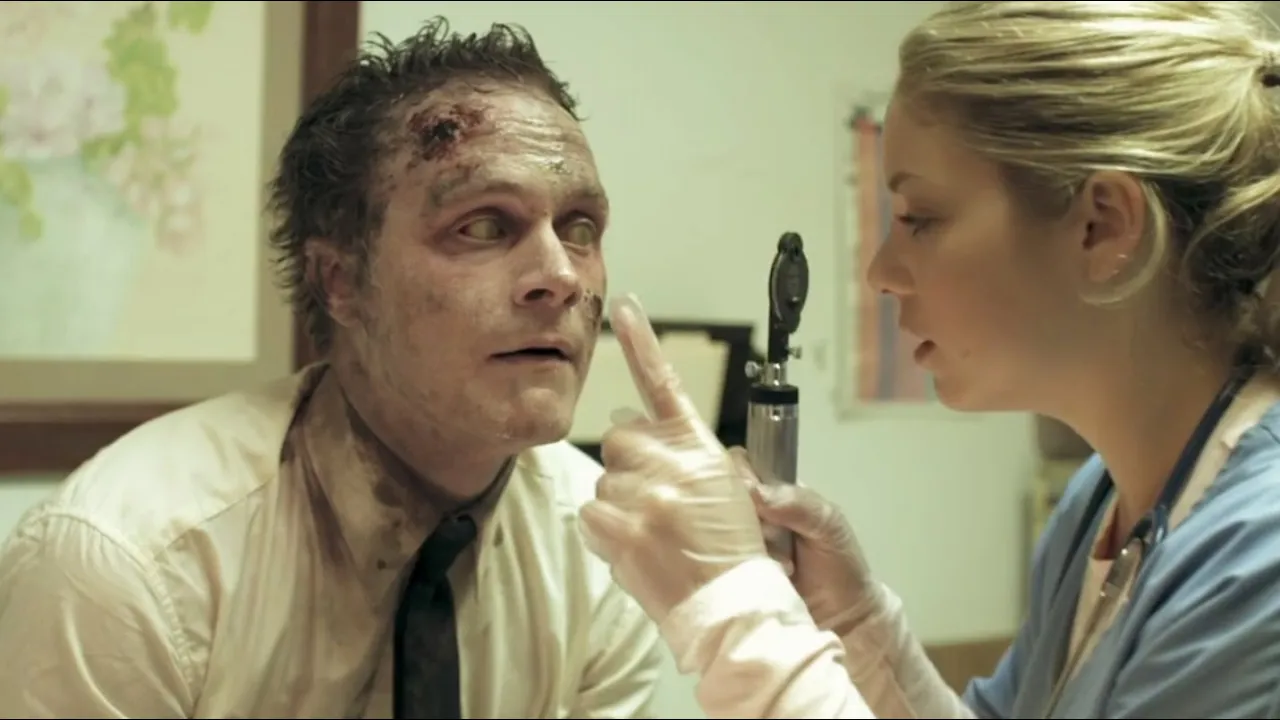 In the next scene, Joey escorts Bart to a nearby hospital, where he quickly gets to work weirding out a nurse. She is not only shocked by the stench of his rotting flesh and his pale eyes, but also by the fact he shows her his stitching to prove he’s been embalmed. Soon, though, the police are called, causing Bart and Joey to flee.