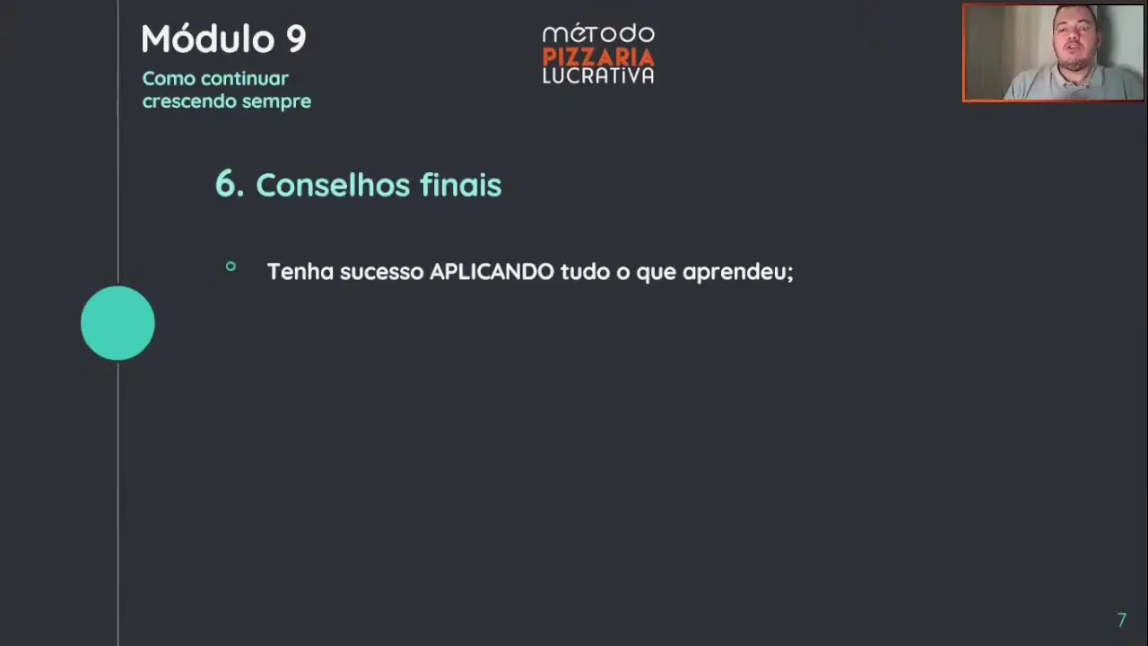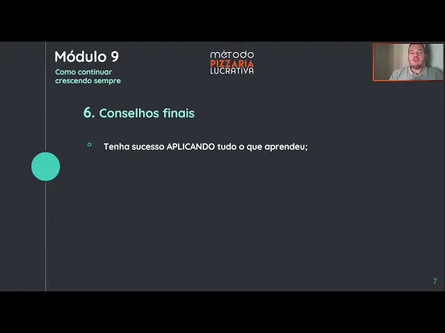 [Música] próximo passo conselhos finais que eu posso dar para você desse mdulo eh se você pega e e aplicou tudo isso que eu coloquei em todos os módulos você assistiu aplicou reassisti foi lá buscou entendimento ficou com dúvida pergunta vai lá e resolve você vai ter sucesso então continua aplicando esqueceu alguma coisa porque às vezes você tá tão no automático no dia a dia ou com muito problema ou muito ocupado ou muito ocupado ali com os afazeres compra contas a pagar funcionário uma coisa outra mas lembre reserve um tempo para que você consiga continuar crescendo