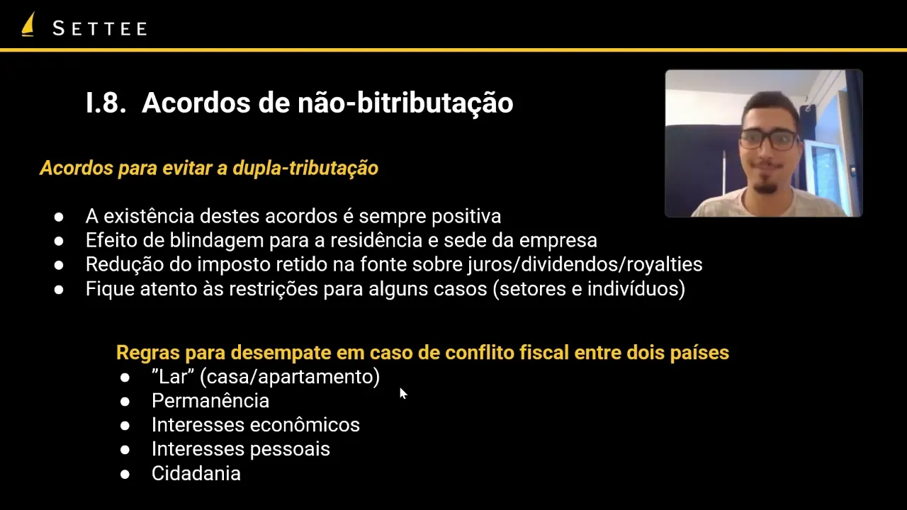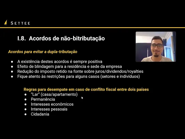 Olá aqui é o Francisco da Seti voltando para mais uma aula do nosso curso de teoria das Bandeiras dessa vez a gente vai falar sobre acordo de tributação e impostos retidos na Fonte em relação ao acordo de nome tributação O que é importante saber Esses são acordos firmados entre dois países ou seja de forma bilateral para evitar a dupla tributação eles também são chamados de acordos de dupla tributação mas não é porque vai ter dupla tributação assim porque eles impedem eles fazem com que não seja tributada a mesma renda duas vezes né Então esse é