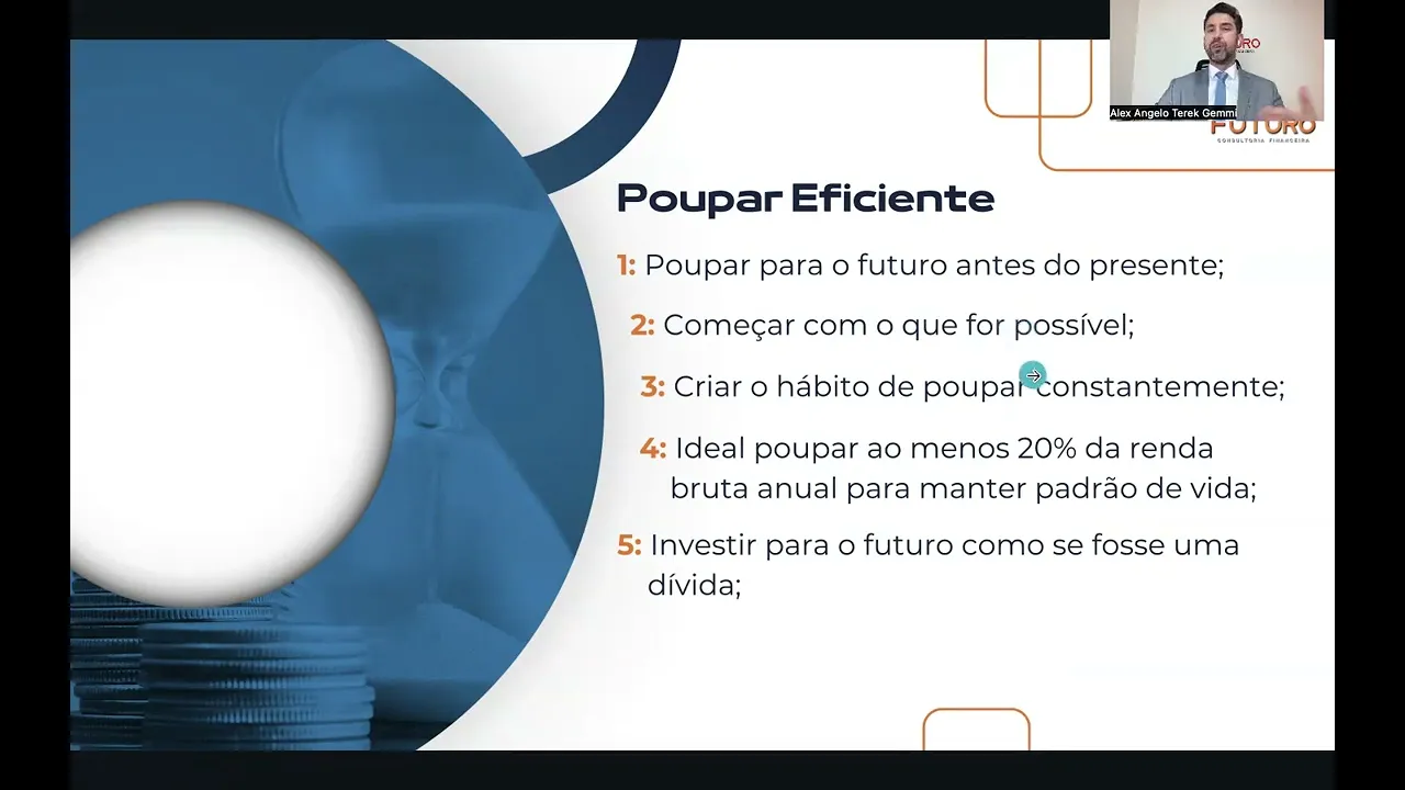 em prática a gente tá tentando aqui não tá conseguindo para te ajudar ali a controlar melhor as Finanças já que a gente te passou as orientações de como controlar pelo cartão pela planilha pelo aplicativo Então vamos lá simulando cliente aqui gente vou te mostrar novamente vou relembrar a importância tá de poupar eficiente e conquistar Esse passo como a gente viu lá na reunião de momento x quando apresentei os oito passos Pilar de educação financeira é o maior GAP do brasileiro tá então poupar eficiente né ele traz aqui algumas orientações poupar Para o Futuro antes do