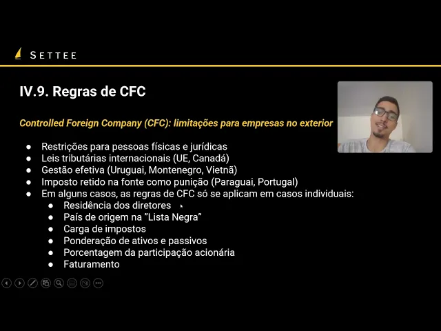 tá bom aí Além da questão de regras de gestão efetiva a gente tem realmente as regras de CFC as leis tributárias internacionais E essas são mais difíceis de serem evitadas no caso as regras de gestão efetiva a gente tá falando de quem é o diretor né quem está dirigindo a empresa no caso as leis tributárias internacionais ou regras de CFC ela se aplicam para os sócios né para quem é dono de uma empresa no exterior e aqui tem muita variação entre as regras dos diferentes países mas assim no geral significa que se for determinado que