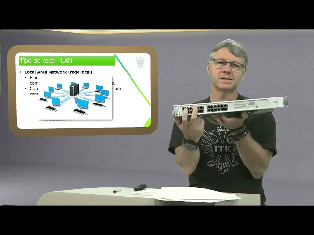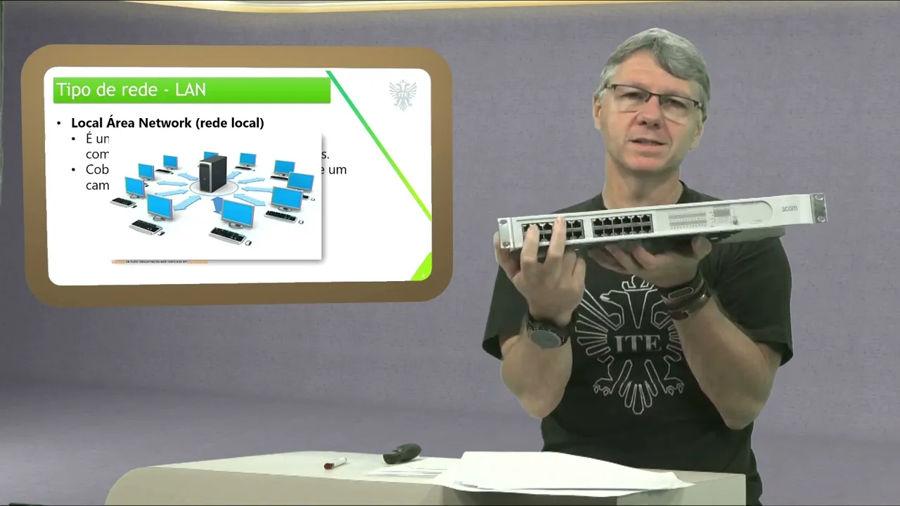 100 megabytes por segundo quando ele tá laranjinha significa velocidade é menor Então tá pegando a 10 mas pode ser a giga então cada um vai depender da rede do computador do cabo aquelas coisas todas que nós já vimos né então nós temos essas características aí e aí nós temos um outro equipamento né É até confunde um pouquinho do que nós temos em casa a pessoa fala tem um roteador em casa é mais ou menos a mesma coisa um roteador que nós temos em casa é diferente desse roteador aqui faz praticamente o mesmo papel né mas