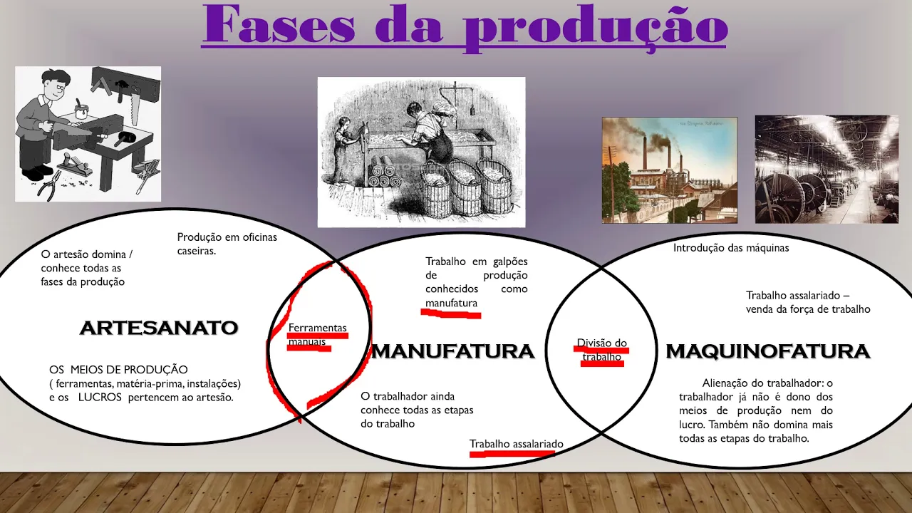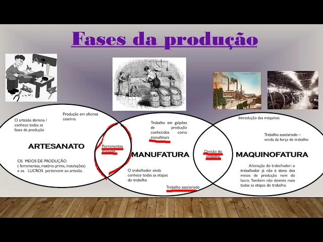 no local que pertence as duas se separaram isso tá as duas fases de produção artesanal de manufatura continua utilizando-se de quente ferramentas manuais então nós temos essa característica na nossa 2014 uso de ferramentas manuais outro agora a modificação é possível a gente perceber trabalho em galpões de produção tá é que também o ambiente de produção também é chamada de manufatura é deixa de ser aquela oficina caseira menor onde geralmente estava um artesão só no máximo alguns ajudar alguns poucos ajudantes e passa para galpões geralmente com maior é de pessoas mestre conduzia né a produção mas