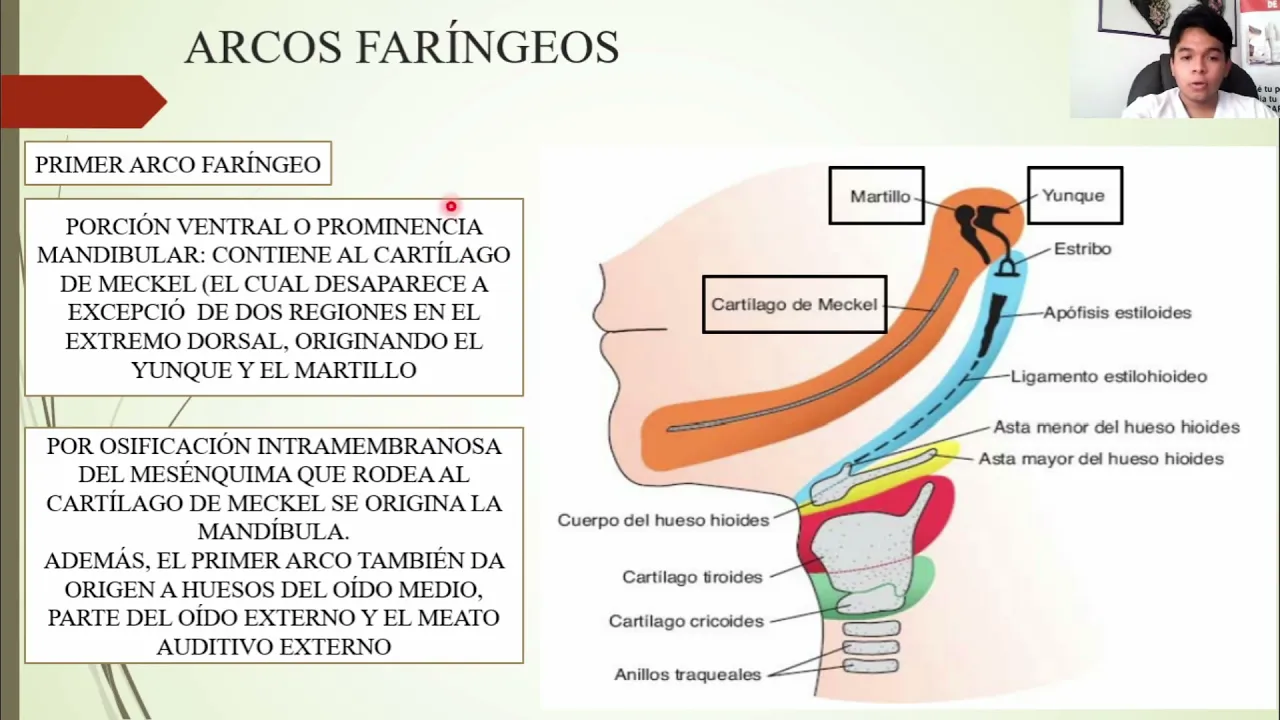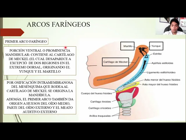mar este es el martillo y el hueso yunque Entonces tener en cuenta en cuenta la importancia del primer año far y tiene dos porciones una porción dorsal que nos va a brindar el maxilar y una porción ventral que nos va a brindar los articular lo mandibular es por el cartílago de meckel que en su extremo dorsal persiste para así darnos el martillo y el yunque por otro lado esta parte de cartílago de meckel para desaparecer sin embargo este cartílago de meckel antes de desaparecer Va a estar rodeado de mesénquima y este mes enzima que rodea