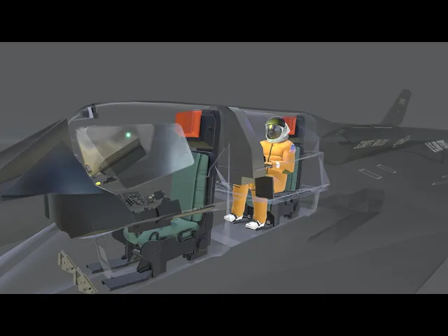 These cables pull the pilot's feet tight to the seat frame during ejection to avoid striking limbs as the seat blasts out of the cockpit. Equipment The nose and side bays at the front of the plane have components for both airplane functionality and mission-specific objectives. I'll show you the zoomed in individual units, and then we'll zoom out so you can see their range and capabilities from 80,000 ft (24,384 m) down to the earth's surface.