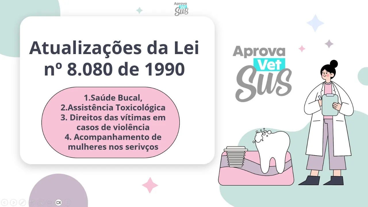 Olá pessoal sejam todos muito bem-vindos a mais um vídeo aqui do aprova vetus essa por se tratar de uma aula especial eu vou disponibilizar tanto para os meus alunos do curso completo preparatório de saúde pública e legislação do SUS quanto também aqui no canal do YouTube para vocês bom pessoal quando eu gravei pela primeira vez uma aula sobre atualizações da Lei 8080 de 1990 eu foquei especificamente em saúde bucal porque naquele momento Essa tinha sido a grande alteração da nossa lei orgânica da saúde no entanto recentemente entre 2023 e 24 nós vemos outras importantes atualizações