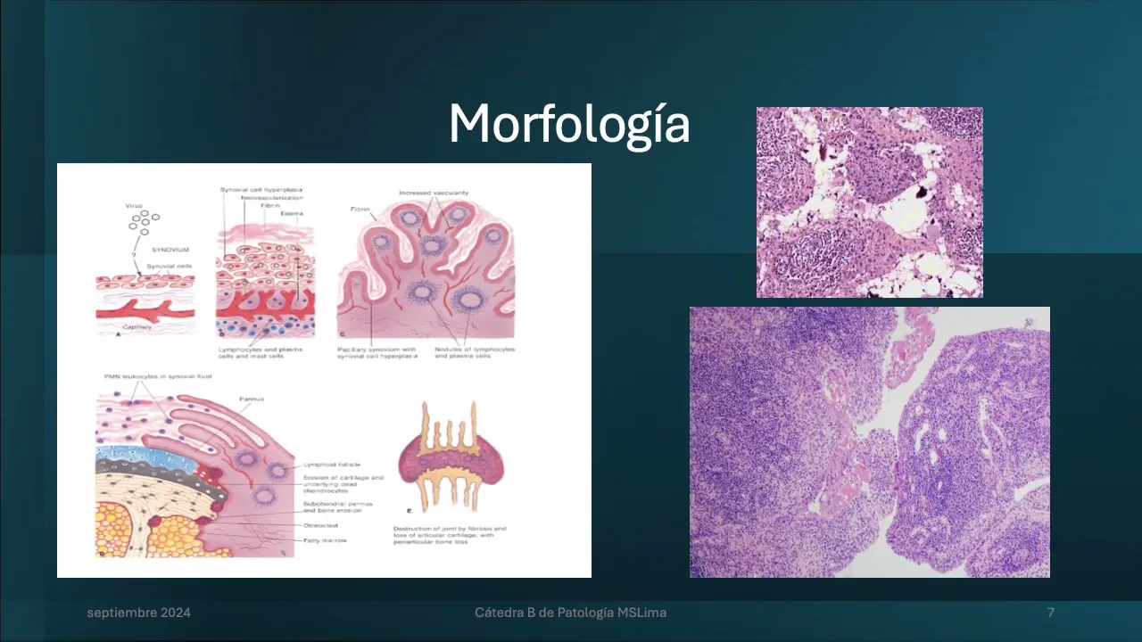 y va aislando el cartílago y el líquido sinovial recordemos que el panus tiene colagenasas y tiene metaloproteinasas que van destruyendo todo el tejido a su paso y por otro lado que habíamos visto que se estimulaban a los osteoclastos lo cual empieza con la lesión del hueso por debajo de la articulación ese panus penetra el hueso subcondral subcondral y también afecta los tendones y los ligamentos Entonces de esa manera empieza a generar deformidades de la articulación inestabilidad y dificultad Y anquilosis de esa articulación eh el líquido sinovial empieza a aumentar su volumen se hace turbio eh
