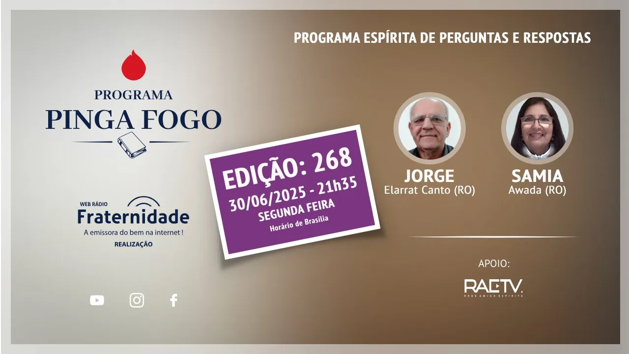 edição do Pingafogo. Permita, Senhor, que os benfeitores amigos possam estar ao nosso lado, nos ajudando, em especial ajudando o Jorge para que ele seja teu instrumento, esclarecendo e Ao mesmo tempo trazendo palavras de conforto aos corações que aqui buscam força também para continuar a sua jornada. Certo de que tu estás conosco, vela conosco. Nós começamos essa edição de número 268 do programa Pinga Fogo neste dia 30 de junho de 2025. Muito obrigado, senhor. Ô, Jorge, nós nem combinamos nada, mas hoje tem é isso que eu ia falar. Hoje tem uma data especial, né? É, hoje