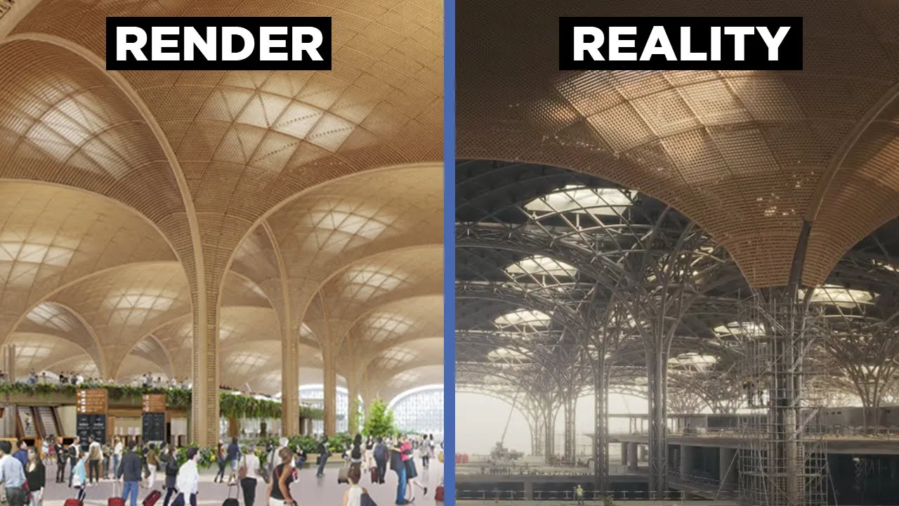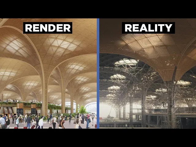 role in keeping the building cool as Plants release water vapor through their leaves in fact this airport has aimed to be one of the GRE greenest in the world it'll be run almost entirely on energy generated from on-site solar panels this massive open space is where all the passenger processing security and immigration and shops are going to be stretching out from the main building are peers where the terminals are going to sit they're a foil shaped like an enormous Boomerang or airplane wing so as to optimize walking distances construction works here are well on the