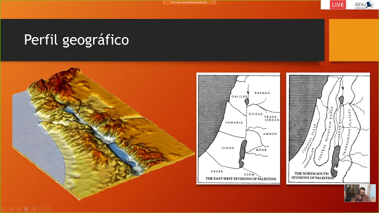 e aí bom então nós vamos falar hoje sobre geografia bíblica e a importância que tem estudar esse conteúdo né então por que que nós vamos estudar geografia bíblica ela a disciplina ela busca estudar exatamente as terras bíblicas e os povos antigos do crescente fértil crescente fértil se você nunca ouviu falar disso pode ficar tranquilo que você vai ouvir falar disso o tempo todo e você até o final já vai saber de cor o que que significa isso mas a o crescente fértil é uma é uma região que vocês vão ver no mapa daqui a pouco só que passa todo o caminho que nós chamamos de mesopotâmia também vão saber já sobre o que que é isso passa pela terra de israel e chega até ali próximo à foz do rio nilo no egito então estudar os povos antigos do crescente fértil para a compreensão da história bíblica e das escrituras e o foco desse aqui época a história de israel nós não vamos nos aprofundar tanto na história dos povos ao redor de israel por exemplo na dos povos que habitaram a síria dos povos que habitaram a península da anatólia que hoje é a turquia também não vamos nos aprofundar na história do egito que tem muita relação com a história de israel porém não vamos entrar muito na história deles a também não vamos falar sobre a história dos impérios mais do oriente como os pardos os partos os medos os peças vamos falar alguma coisa mas sim tudo que estiver relacionado é a história de israel é é e qual a importância é a importância de estudar a geografia bíblica é porque ela nos auxilia a compreensão do texto né quando você vai ver alguns textos bíblicos que fala que abraão e jacó que josé algum dos patriarcas alguns dos das tribos de israel eles saíram de um lugar e foram para o outro você tem mais ou menos noção dos trajetos e dos caminhos que eles tinham que tomar para chegar você entende qual era o perigo por exemplo dessas viagens ou qual a extensão da trajetória há quanto tempo levava imagine eles levando caravanas aí eles não iam apenas duas três pessoas iam às vezes aquela história muito interessante de jacó voltando para a terra de israel encontrando o seu irmão esaú você percebe a quantidade de coisa que ele tava carregando quando ele tava voltando para a terra de israel e aí ele tem aquela estratégia para poder acalmar o saião fez uma mensagem há pouco tempo a respeito disso a a oração do seu irmão ele divide em pedaços o seu o seu séquito lá o sua o grupo que ele tá levando para poder se tivesse algum ataque alguma coisa é ele poderia fugir com outro grupo né então eram viagens muito complicadas vocês vão entender isso também e também os fatos descritos na bíblia tornam-se claros condução estudados a luz da geografia bíblica então para começar a gente precisa entender a importância da do estudo da história de israel que que israel é tem um papel tão relevante tão preponderante na história da humanidade na história do mundo tanto ocidental como oriental israel foi retratado dessas dessa forma como vocês estão vendo nesse mapa antigo aí é como sendo o centro do mundo vocês vão perceber e no lado taís a copa do outro lado está escrito ásia no outro lado está escrito a áfrica é bem provável que esse é o desenho ele eu ainda não eu fiquei de fazer de pesquisar a data exata desse desse desenho mas eu não peguei ainda é provável que seja antes das grandes navegações né porque você percebe que a américa não está mencionada nesse pedaço aí e em jerusalém está naquela bolinha do centro ali então é como seguir os além fosse realmente o centro do mundo daquele momento o centro do mundo daquele período e se você olha o mapa que tá na nossa esquerda você percebe aquela aquele quadrado vermelho e aquela linha zinha vermelha ali no meio é uma parte que estava marcada de vermelho é exatamente israel é o israel moderno inclusive aquela o mapa do israel moderno e você percebe onde israel realmente está numa no local de passagem ele e da se você for pensar nos tempos antigos todos os povos que estavam na região aqui da áfrica os povos da ásia que quisessem fazer algum tipo de comércio com os povos africanos ou que quisessem vir da região da ásia para a região da europa em ali israel na sua proximidade e tudo passa por ali a gente vai ver mais um quadro aqui para vocês terem uma noção do perfil geográfico do território de israel a e a divisão que normalmente é feita né você tem uma divisão a leste oeste norte sul no caso divisões das áreas então se você pegar esse primeiro quadro mais a sua direita você vai ver que são divididos por exemplo planície costeira aqui no mapa dá para você ver bem essa parte aqui da planície costeira que hoje inclusive é onde está é aquela parte mais baixa a faixa de gaza a a ser falar que é uma região muito importante essa região da sefelá bom e é uma região extremamente fértil porque ao lado da sefelá você tem a montanha a cadeia central as montanhas centrais você tem as montanhas da judeia aqui na parte de baixo as montanhas da samaria mais do centro e o a região da galileia inclusive esse bico aqui que faz uma entrada de acordo como você pode ver nesse mapa 3d aqui tem uma entrada que é o vale chamado vale de jesus à ela é a região da cadeia montanhosa do monte carmelo monte carmelo extremamente importante na história do profeta elias nós conhecemos a história de elias na batalha dele contra os contra o sacerdote de baal e aserá é depois você tem um vale do jordão que você pode perceber no mapa tridimensional que uma falha geológica né aqui embaixo essa parte azul é o que representava o período no período antigo o mar morto e não está mais assim o mar morto está bem menor hoje em dia secou bastante mas é a região mais a mais baixa da terra não é e e e do outro lado você tem a transjordânia que é esse platou de montanhas do lado de cá então vam