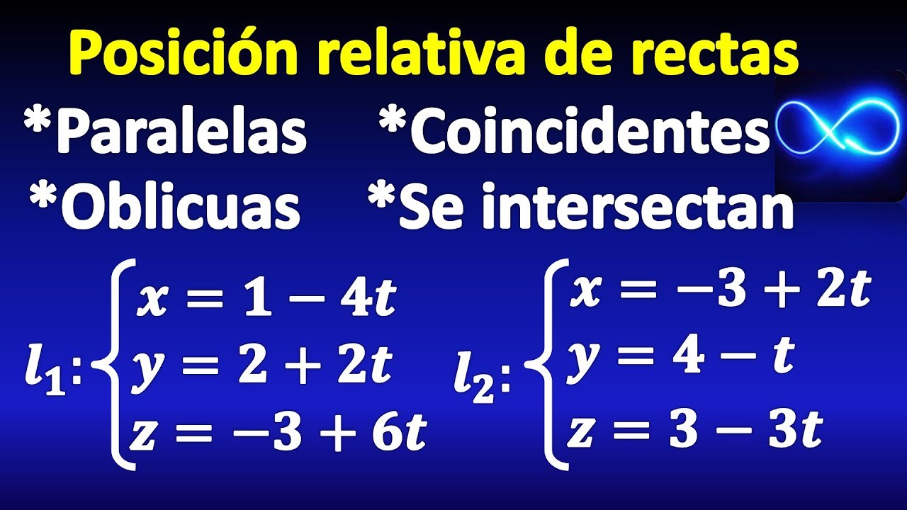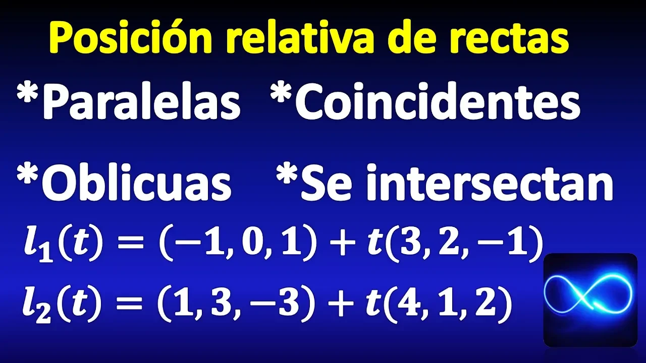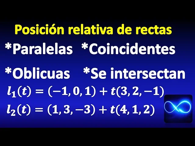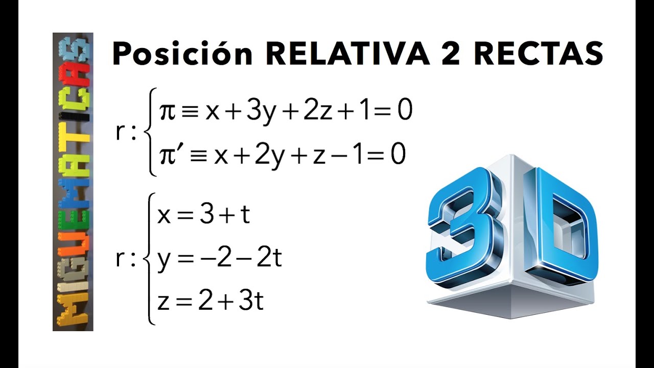hola y bienvenidos a otro vídeo de mate fácil en este vídeo vamos a hablar acerca de la posición relativa de dos rectas en el espacio es decir vamos a analizar todas las diferentes posiciones en las que podrían estar dos rectas voy a empezar mostrando esto graficamente y después vamos a ver analíticamente como darnos cuenta de cuál posición tienen dos rectas bueno graficamente tenemos los mismos casos que en el plano dos rectas en el plano pueden ser o bien para de las obien interceptarse en un punto en el espacio dos rectas paralelas se verían de esta