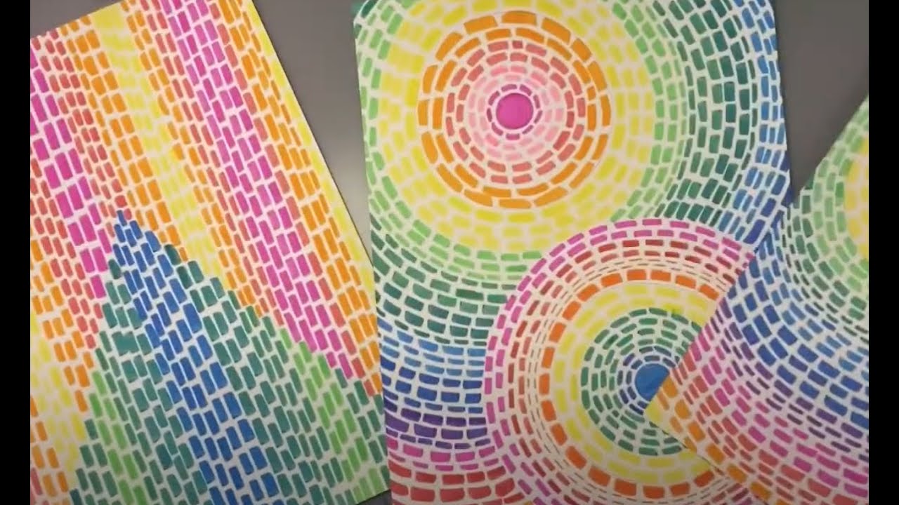 uma da outra e terem a mesma largura também é importante deixar o branco aparecer o mínimo possível na parte de trás Então você tem que cuidar muito com a distância para ficar um efeito legal Eu segui uma sequência de cores que é essa aqui que eu vou deixar para vocês no vídeo mas cada um escolhe a sequência de cores que preferir e você vai completando essas pinceladas em mosaico até fechar a folha até a folha inteira estar [Música] pintada e esse é o resultado da primeira opção de trabalho essa é a segunda opção de atividade