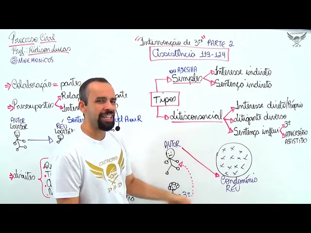 parte só que para você ser assistente eu preciso de dois pressupostos o primeiro pressuposto é que esse assistente esse terceiro tem que ter uma relação com as partes E além disso ele tem que ter um interesse qual que é esse interesse fala para mim ele tem que ter interesse jurídico que que é interesse jurídico é interesse de que a sentença seja favorável ao autor ou ao réu responde para mim em que tipo de procedimento cabe Assistência assistência acaba em qualquer procedimento e essa assistência ela cabe em qual grau em qualquer grau Só que tem um
