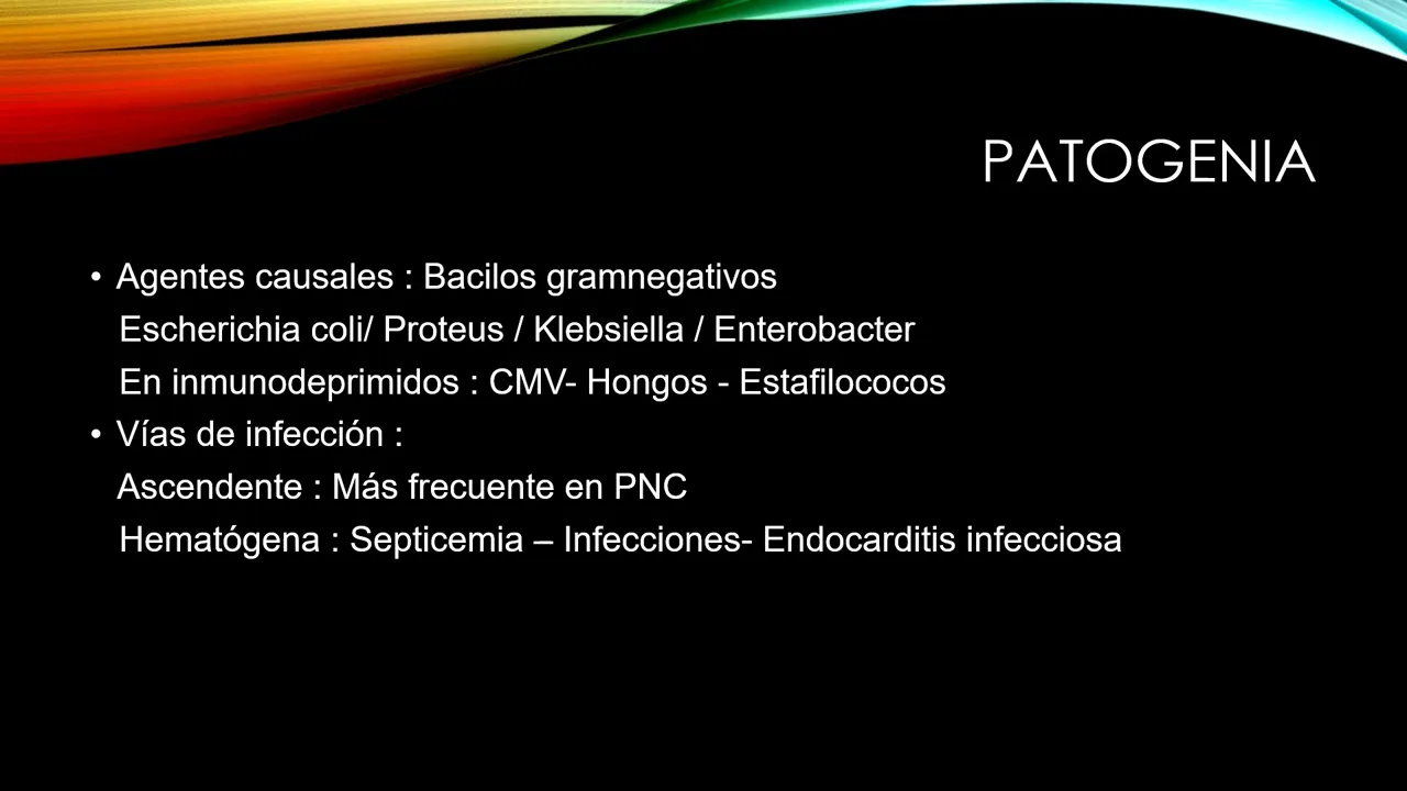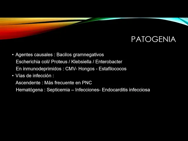 presentar en dos formas clínicas aguda y crónica la forma aguda se caracteriza por una diseminación bacteriana a partir de una vía hemato henna o ascendente siendo esta última la más frecuente en la forma crónica también o diseminación bacteriana pero asociada a reflujo básico ureteral con respecto a la patogenia los ejes agentes causales más frecuentes son los bacilos gram negativos como escherichia colli propios klebsiella enterobacter en pacientes inmunodeprimidos lo que vamos a encontrar son las infecciones por citomegalovirus hongos o estafilococos dijimos que las vías de infección más frecuentes son la vía ascendente y la vía de