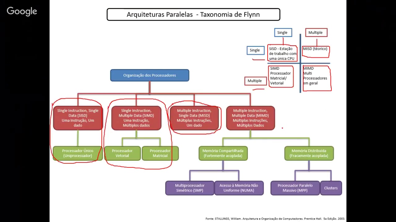 dados são os computadores convencionais cereais do tipo modelo eu sou nenhuma com instruções executadas e série porém estágios né E vão aí busca-decodificação-execução que podem ser paralisados que a gente vai falar na próxima na última aula em pó epilare e no segundo caso na 2ª classe nós temos múltiplos traction and single deita né que estão os vários processadores que recebem instruções distintos mais operam sobre o mesmo conjunto de dados né E aí a gente tem o maior um grande exemplo que são os algoritmos de criptografia né que são usados aí para depois de mensagens é