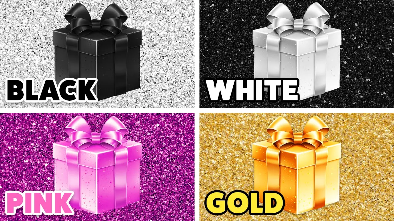 Welcome back to Quiz Blitz Are you ready to discover all your gifts? You can choose between the black, white, pink, or gold gift First gift! Choose your phone ! Watch out, one of the 4 gifts is a trap Let's go, let's see what you got You're lucky Choose your perfume What's your choice? Awesome Choose your phone case Like this video if you chose a good gift Choose your shoes Feeling lucky today? You're doing great Choose your room Hope you got an amazing gift Choose your dessert You're doing great Choose your cake I'm sure you'll love