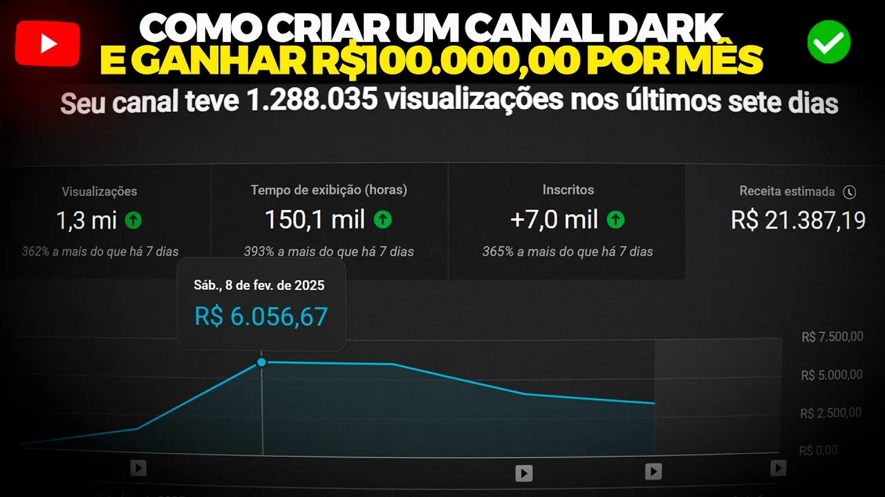 Giovan tô tentando criar um canal Dark mas não vai de jeito nenhum Mas de jeito nenhum mesmo Olha só esse canal dar que eu tô te mostrando aqui ele é de um aluno da minha mentoria individual certo ele conheceu o YouTube dia 1 de Janeiro dia 12 Ele publicou o primeiro vídeo dia 27 ele monetiz hoje dia é um mês depois que Ele publicou o primeiro vídeo de hoje dia 13 de Fevereiro já faz fez R 21. 000 na semana ah na semana duvido bom se você tá com esses olhando esses guruz aí fica mandando print essas coisas ó tem que mexer tem que mexer aqui também ó não adianta ficar mandando print certo então o que acontece esse canal ou r$ 1. 000 nas semanas né Na semana na semana só que não atualizou o dia de ontem que deve dar mais uns r$ 3.