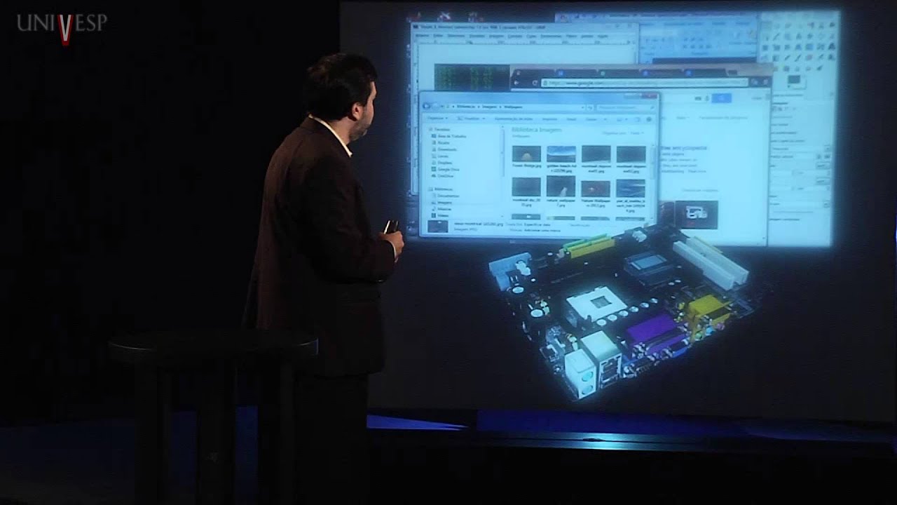 [Música] bem vindos a mais um encontro de informática o nosso encontro de hoje nós vamos falar sobre o hardware que é o conjunto de circuitos eletrônicos que compõem o computador nós falamos em circuitos eletrônicos o que nós temos essencialmente é um conjunto de dispositivos que se combinam para realizar alguma função aqui por exemplo nós temos dispositivos passivos que são os resistores r1 r2 capacitores um conjunto de semicondutores que são os de outros e transistores nesse arranjo nessa combinação esse circuito eletrônico é um amplificador de áudio também um sinal de entrada está aqui embaixo pequenininho e
