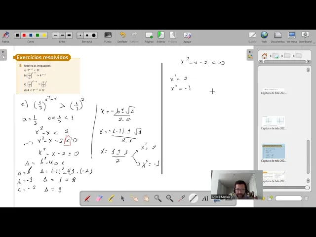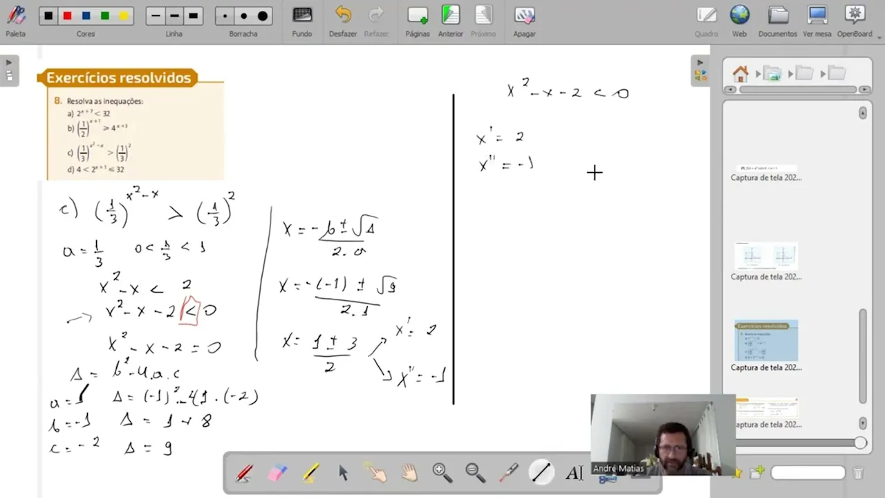 desigualdade inverte fica trocado então x qu - X é menor do que 2 porque por ser menor do que 1 e maior do que zero inverte o sinal do igualdade então x qu - x 2 tá aqui passa com o sinal contrário -2 é menor do que 0 para resolver isso aqui nós vamos usar a equação do segundo grau vamos transformar num equação mas depois nós temos que lembrar dessa questão aqui ó Ok então x qu - x - 2 = 0 Grand x pela forma de Bas Delta né Qual que é o valor de