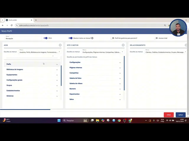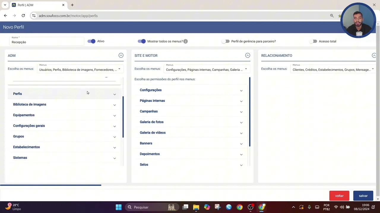 acesso né então o usuário ele vai conseguir visualizar todos os menus Mas os que o perfil dele não tem acesso ficarão bloqueados para para visualização também podemos associar aqui o perfil a uma gerência para parceiro e também dar acesso total ao dar acesso total né damos acesso a qualquer ele pode acessar todos os menus e todos os tópicos ali que que temos disponíveis nos menus laterais mas nesse caso aqui Se quisermos inserir permissões específicas podemos escolher Aqui de acordo com cada menu que temos então aqui a gente tem todos os menus Digamos que a recepção