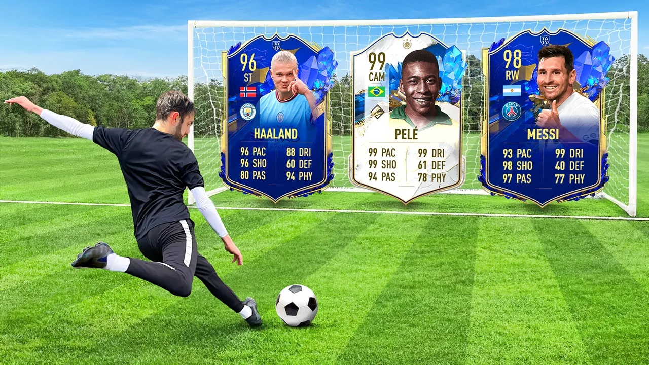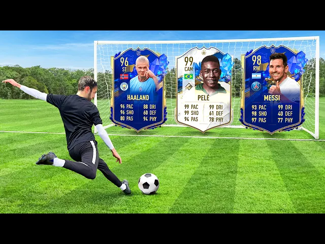 today whatever car you hit you get for your team Whoever has the highest rated team by the end of the video wins ,000 Mystery Box God I got to win it in this game the best cards are the hardest to get we got to go for that CR7 oh no no no yes my turn to get Ronaldo no and even though we both fail our first shot we get three shots for every challenge if you don't hit any card you automatically get the worst category card well since I'm wearing a shirt I have to go