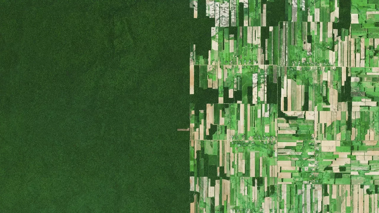 This overview shows deforestation in Santa Cruz, Bolivia immediately adjacent to untouched tracts of rainforest. Deforestation in the country has primarily been driven by the expansion of mechanized agriculture and cattle ranching, so as the country tries to meet the demand of its growing population and feed them, the sacrificial destruction of its rainforest has taken place to do so. It is estimated that the country lost 4.