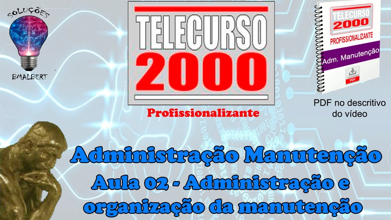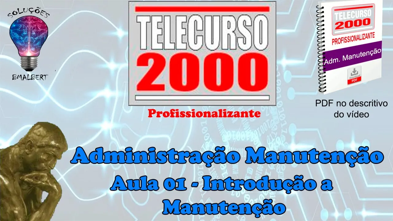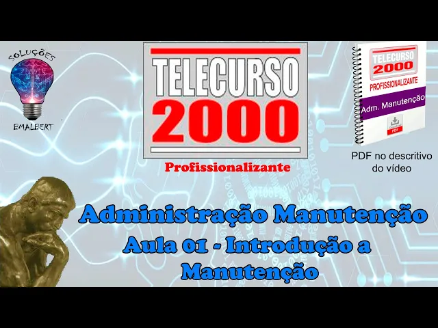 E aí [Música] [Música] E aí [Música] a atenção começa agora uma tele aula de administração da manutenção do curso profissionalizante Você vai assistir a Teleaula de número um Bons estudos e [Música] e começa agora o curso de Administração da manutenção das próximas 10 tele-aulas vamos saber como a indústria se organiza na hora de cuidar da manutenção de suas máquinas e equipamentos você vai ver como é feita a administração da manutenção vai conhecer vários tipos de manutenção e entender porque o controle de peças sobre excelência é tão importante no planejamento da manutenção toda a produção se