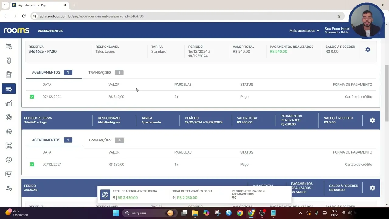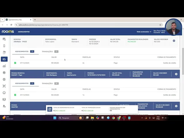 valor de 50% na entrada no mesmo dia que a reserva é feita e o restante o saldo seria cobrado um dia antes do chequin então aqui a gente pode acompanhar também que foram realizados dois agendamentos pelo próprio pay e também uma transação já feita né no caso no dia de hoje dessa entrada provavelmente aí quando chegássemos no dia 9 né que seria um dia antes do chequim o restante também seria cobrado pelo pe aqui esclarecendo um pouquinho mais sobre esse pedidos com relação ao pedido do Roberto Carlos A gente tem duas reservas é possível fazer