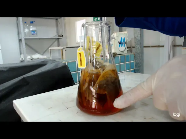 da cafeína bom então passados alguns minutos vocês podem observar que a solução ficou mais escura porque a água quente está extraindo os compostos orgânicos que estão presentes dentro dos cacheados do chá preto Ok então eventualmente novamente vocês veem uma agitada com um bastão de vidro E então após Entrar em fervura e permanecer por cinco minutos vocês podem observar que a solução ela ficou bem mais escura e eu desliguei a chapa de aquecimento após os cinco minutos agora a próxima etapa é a retirar esses sachês e dentro do erlenmeyer para que possamos continuar a etapa de