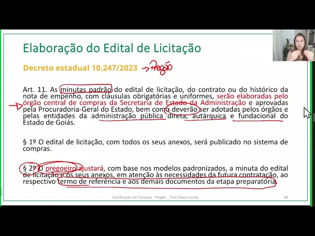 propostas é o início da seleção do fornecedor bacana pessoal então vamos lá vamos para o nosso curso Eh vamos estudar bastante aí sobre a elaboração do edital de licitação Então vamos lá elaboração do edital de licitação deixa eu pegar aqui aqui vamos lá bem gente eu coloquei minha imagem aqui em cima para não atrapalhar ali a nossa leitura do slide bem gente eu comecei aqui pelo Decreto Estadual 10.247 já ia trazer aqui a lei 14133 Mas eu preferi trazer o Decreto Estadual 10 247 que é o Decreto que trata do pregão bem esse decreto diz