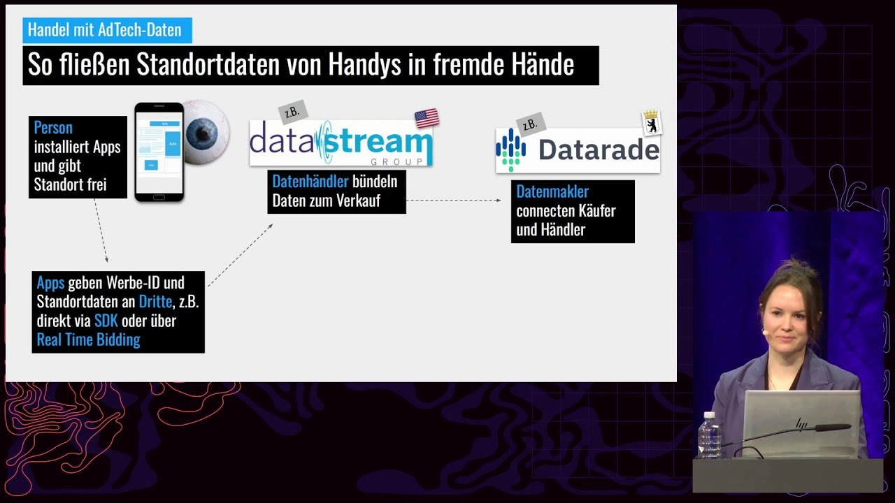 000 Fahrzeuge wo die geokordinaten nach einer nachkommerstelle abgeschnitten sind das sind also ungefähr Auflösung von 10 km bei Volkswagen und Seat sind insgesamt 470 Fahrzeuge auf 10 [Applaus] cm zum Glück gibt's natürlich die passende AGB dazu von Volkswagen im Abschnitt 8 Analyse zur Verbesserung von Produkten gibt's dann auch den Punkt Standortdaten z. B gekürzte GPS-Daten schreibben sogar zweimal hin darüber hinaus kürzen wir auch GPS-Daten ihr habt halt vergessen ja bei Volkswagen und Seat hier sind die geokord mal nach Zeit bei Seat sammeln sie im Prinzip ab dezember 2022 bei Volkswagen ab September 2023 hier noch mal konkret die Modelle die jetzt in diesem datenliag konkret vorkommen Audi und Skoda dann Seat oder Cupra Born und VW ID 3457 gucken wir uns mal die Geokoordinaten an und da ma ich mal vorweg ein Disclaimer ja wir haben sie mit ser viel Betroffenen zu tun und wir wollen deren Privatsphäre natürlich schützen und deswegen haben wir so ein kleines Verfahren gemacht wo die Daten sauber anymisiert werden mit einem clustering Verfahren Gaus mict Model und im Prinzip werden Cluster nur so weit runtergebrochen dass mindestens fünf Fahrzeuge drin sind und die Klaster werden D mit normal verteilten zufallspunkten dargestellt und so weiter kurz um eine Identifikation der einzelnen Fahrzeuge ist ausgeschlossen bei den Screenshots den wir jetzt zeigen und den ersten Screenshot ist wir zeigen mal mal das Volkswagenwerk in Wolfsburg das Streifenmuster das hier unten seht sind die Parkplätze für die Mitarbeiter die fahren halt viel diese Fahrzeuge das ist ganz Wolfsburg Hannover ganz Niedersachsen ist es sehr beliebt Hamburg Berlin Köln München London Oslo Stockholm Amsterdam Brüssel Kopenhagen wenn man mal alle mal einzeichnet sieht so die Europakarte aus 900 [Applaus] Millionen da kann man gut sehen wo die betroffenen Fahrzeuge fahren natürlich Deutschland aber auch Belgien Niederlande Großbritannien Skandinavien und natürlich vorrangig dann auch in den in den Städten was steckt in den Daten jetzt habe ich mal die Chance für einen shameless Plug weil ich nämlich an dem kartenframework arbeite wir haben ein Fan haben wir beim S datalab entwickelt wird jetzt vom miiz und nnet weiterentwickelt und das ist super da kann ich auch meine 900 Millionen Geokoordinaten reinwerfen und ich habe hier mal so ein Screenshot gemacht da sut man an den BR Flughafen ran und dann kann man sich so ein Taxi auswählen und dann kann man mal sehen wie das Taxi so zum zwischen BR Flughafen und der Stadt hin und her pegelt pendelt und rechts äh zu welchen Zeiten es sozusagen wann an welchem Standort war aus komplett offensichtlichen Gründen muss ich jetzt hier alle privaten Daten unkennlich machen und man sieht halt nicht viel und das ist sozusagen das Kernproblem wir können ja euch einfach nicht die Originaldaten zeigen ja gerade die CCC Hackerethik sagt private Daten schützen und wir spielen h mit der Privatsphäre von 800. 000 Betroffenen und haben wir langeübel wie gehen wir denn damit um und dann ist mir eingefallen bei Gerichtsverhandlung darf man auch nicht fotografieren aber man darf die Leute zeichnen und da fel ein der CCC hat eine Geheimwaffe und zwar Stella und mit Stella ja sind wir mit Stella haben wir einmal die komplette Show gemacht wir haben uns alle Details angeguckt was sagen im Prinzip diese Daten über Betroffene aus und sie hat das im Prinzip gezeichnet um euch ein Eindruck zu vermitteln ihr könnt also die Daten sehen durch die Augen von Steller hier ist mal das erste Beispiel hier ist ein Privatgrundstück mit ein paar roten Punkten da ist ein Fahrzeug das parkt dann immer an der gleichen Stelle kurzer Hinweis wenn so ein Fahrzeug seit zwe Jahren datenammelt sind das so eher 700 Punkte auf diesem einen Grundstück und rechts hat seller mal so angedeutet so eine Kalenderdarstellung wann das Fahrzeug denn an diesem Ort ist und das ist natürlich dann immer nachts unter der Woche bzw das gesamte Wochenende zwischendurch gibt's dann mal ein großen Block wo das Fahrzeug woanders ist und zwar nämlich am Arbeitsplatz da arbeiten die Leute so von 8 bis 17 Uhr kan man gucken bei welchem Arbeitgeber dieses Betroffene Fahrzeug so parkt generell sieht die Route von einer Privatperson ungefähr mal so aus die ist deutlich komplexer weil die Leute natürlich auch in Urlaub fahren ihre Freunde besuchen da gibt sozusagen sehr komplexe Netzwerke die daraus entstehen istm das vereinfacht dargestellt aber wir können auch sehen wo die Person einkaufen geht und wann und der Woche machst du dann mal schnell deinen Einkauf für fürs Mittagessen oder so und den Wochenende Kauf den macht man dann am Samstag übrigens ein fun fact wir haben ja auch einige Fahrzeuge uns angeschaut von eigentlich Männern in hohen Position die nicht am Mittwoch um 14 Uhr ein Großeinkauf machen und damit war dann relativ schnell klar dass es nicht ihr Fahrzeug ist sondern das von ihrer Ehefrau das konnen wir auch später nachweisen und die große Frage ist weiß die Frau dass ihr Mann sie beobachten kann wo sie mit dem Fahrzeug unterwegs ist da kann ich auch die Vorträge von Anne rot zum Thema digitale Gewalt äh empfehlen vielleicht schckt dir der eine oder andere eifersichtig jemand seine Frau damit ohne dass sie es [Applaus] weiß wann und wo geht die Person Tennis spielen so Klassiker Donnerstag Nachmittag oder abends geht man noch zum Golf spielen oder zum Yoga schwimmen haben wir gesehen allerh wann und wo bringen die Personen ihre Kinder in die Schule oder in die Kita teilweise konnen wir die Kinder deanonymisieren steht in der Lokalpresse ein Kind mit dem richtigen Nachnamen hat Preis gewonnen und wir konnten halt sehen mit dem Fahrzeug Mama hat es abgeholt und dann in ein bestimmtes Gebäude rüber gefahren das heißt wir konnten dann auch wissen sozusagen namentlich nennen welche Kinder die Betroffenen haben man kann sich dann aber auch mal so ein Bordell anschauen und gucken wer da so