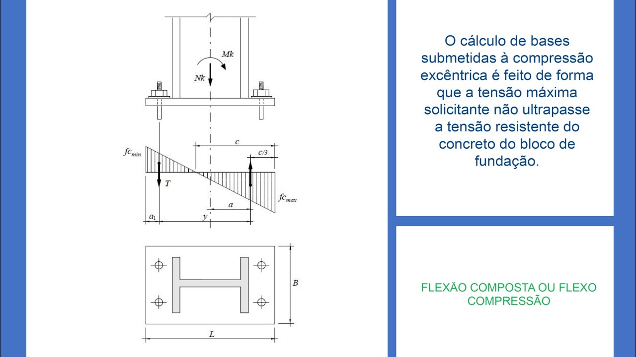 [Música] fala pessoal sejam todos muito bem-vindos a mais um vídeo aqui do canal do professor Bio sintam-se em casa uma casa da engenharia de estruturas se você chegou aqui agora pouco fique à vontade né se você conhece o canal está conhecendo agora fique à vontade aqui a gente fala muito sobre estruturas de concreto estrutura metálica né fazemos muita coisa estrutura de madeira eu quero fazer também e a gente fala de estruturas tanto a teoria quanto na prática e para você que já me acompanha aqui aquele abraço de sempre sejam bem-vindos novamente Se divirtam com mais um vídeo aprendam aqui com mais um vídeo do prossobio se inscreva aí curta o vídeo pessoal ó dá uma curtida lá tem muita gente que tá assistindo o vídeo mas não tá dando aquela curtida ou curtir o joinha me ajuda demais né para que esse vídeo seja indicado para mais gente para que o nosso canal cresça e seja mais visível preciso daquele joinha aí de todos vocês tá bom então conto com o joinha com o like de todos vocês que estão assistindo e estão gostando aí dos vídeos do Professor Bill tá bom e eu trouxe esse vídeo aqui para vocês para a gente falar sobre os chumbadores né Qual o cálculo de chumbadores para as placas de base ali nas Fundações de Pilares metálicos no vídeo passado a gente mencionou a placa de base para uma situação apenas com força normal de compressão ali no Pilar nós ainda teremos um outro vídeo com momento fletor chegou a hora então da gente conhecer quais Aços a gente usa para os filmadores Como é o dimensionamento Qual é a análise como é que eu faço então reparem que não é uma coisa normalmente é que é ensinado Na graduação infelizmente na pós-graduação às vezes passa meio batido também e é aqui no canal do professor Bio que você vai encontrar informação boa em formação direta Sem enrolação para que você apliquem nos seus projetos aplica aí naquela prova de estrutura metálica que você vai fazer aí na graduação naquele trabalho lá da pós de instrumental que você tem que fazer enfim é aqui que você vai encontrar essa informação ó Sem enrolação e Prontinho para você então fica aí o meu convite para vocês embarcar em mais um vídeo aí comprou sobre eu vamos lá para o dimensionamento Oi pessoal então vamos lá para nosso para o nosso vídeo Vamos aprender a dimensionar aí os chumbadores para as nossas placas de base Que Nós aprendemos a dimensionar aí no vídeo anterior né bom pessoal e antes da gente retomar eu vou colocar o link aqui para quem é não assistiu o vídeo anterior mas eu queria retomar um pouco daquele conceito Ok É porque lá nós mencionamos uma uma placa de base vocês lembrarem para um para um pilar 200 por 200 mm de um pilar H né para uma coluna H então a placa ficou 500 por 500 milímetros Ok é dimensionamos a espessura lá naquela oportunidade também E aí o naturalmente depois do cálculo da placa seria calcular os filmadores que é o que a gente vai ver aqui no vídeo e depois de calcular o chumbadores a gente pode checar se o detalhamento ficou Ok em termos de dimensões mínimas entre furos e entre centro de furo a borda da placa Ok então eu quero começar esse vídeo aqui falando um pouco dessas dimensões mínimas tá então eu tenho lá é L E B sendo as dimensões da minha placa de base Tá mas eu tenho algumas dimensões muito importantes por exemplo esse A1 que eu vou circular aqui para vocês tá esse A1 aqui ó tanto numa direção quanto na outra vai ser o quê é a distância entre o centro do furo até a borda da minha placa de base tanto numa direção quanto na outra no mínimo qual que é a regrinha pessoal se eu tivesse uma dores até 25 MM que é muito comuns né em projetos de estruturas metálicas aí do dia a dia então a gente tem em mente 1,8 vezes o diâmetro então é pai depois de calcular o chumbador eu posso voltar no dimensionamento ali no detalhamento da placa de base e checar se essas dimensões mínimas aqui estão Ok pensando inclusive na execução ok nós temos uma dimensão a dois que é de onde termina o perfil metálico vocês estão vendo de onde termina o perfil metálico até o centro do furo serve para o futuro não ficar encostado ali no perfil que depois o pessoal não tem como dar toque nisso lá na obra né E esse A2 O que que a gente tem em mente como dimensão mínima 1,6 vezes o diâmetro Ok então reparem que são números muito bacanas para a gente checar isso detalhamento tá atendendo a norma e se vai atender principalmente critérios de execução tá E aqui eu mostro ainda para vocês essa dimensão e maiúscula né que basicamente a distância entre centros de furos O que que a gente tem em mente pessoal pelo menos duas vezes o A2 né que eu calculei lá com 1,6 sutiã do chumbador Então esse e no mínimo duas vezes o A2 então com isso você vai ter dimensões mínimas a serem respeitadas do perfil até o furo entre furos e do centro do furo até a borda da placa para checar se o seu cálculo da placa de base em conjunto com o cálculo do seu chumbador ficaram Ok estão satisfazendo questões de nome questões de execução Ok então começamos aí com pé direito o nosso vídeo de hoje bom uma vez já vi isso isso aqui que é sempre muito importante é o que que eu tenho para compartilhar aqui com vocês sobre chumbadores normalmente pessoal são barras de Aço de sessão circular tá então são muito comuns né e a função do chumbador eu falei isso no vídeo passado para quem assistiu né vai lembrar disso aí a função é fixar a placa de base no seu lugar porque a placa de Base é que tem aquela função de pegar a carga do Pilar e distribuir e aplicar no elemento de fundação né sem ter problemas de flexão ali da placa em função do chumbador é manter tudo isso no seu lugar é resistir logicamente também os esforços que vão surgir ali de arrancamento dessesalhamento e tudo mais mas a função de 
