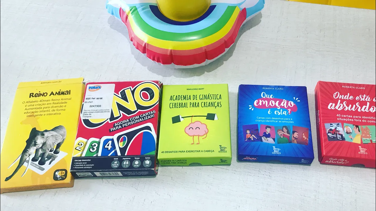 desse jogo é para trabalhar a interação social capacidade de associação e pensamento estratégico então vale muito a pena trabalho muito com as crianças que estão no processo aí de raciocínio lógico matemático crianças que apresentam lentidão de resposta atividades então fica aí né além da gente conseguir usar como intervenção as crianças amo jogar o uno aqui no consultório bom essa caixinha é da roberta claro tanto essa conta próximo que eu vou mostrar pra vocês e essas são caixinhas com desenhos de emoções não chorei aqui pra vocês ó aqui trazem cartas na 40 cartas dez delas trazem