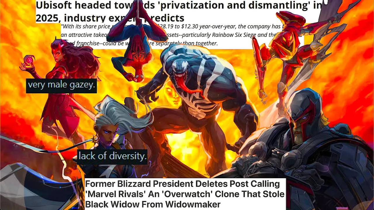hey it's IND demon and today we need to talk about a new game that is making a sweep through the industry in blazing fashion in the form of Marvel Rivals which in my opinion should become the industry standard for how these sorts of ips are given Life and video game form of course people are coping and attacking it for also not being woke Beyond this the Ubisoft situation gets more interesting as buyouts and liquidation talks get thrown around so I want to explore that as well let's get into it firstly Marvel Rivals is here I finally got around to playing it myself and yeah I think it's a pretty great game is it just OverWatch with Marvel heroes absolutely but it feels more fluent to play and I really enjoy the quality of these characters and how everything works for me so far I've mostly been playing as mantis because there's no rooll lock in Rivals as of right now anyways and a lot of people clearly just enjoy Zerg rushing the enemy team and attacking them so I've pretty much taken it upon myself to babysit everybody and keep them healthy by healing their wounds cuz people are morons but mantis is dope though I always end up playing characters in these online games that aren't who I think I'll play at first I also found Venom to be really dope to play as well I love his style of tanking and for DPS so far my go-to is the Punisher who is basically just Soldier 76 meets Bastion from OverWatch but cooler cuz well he's the Punisher dude come on look at him of course Marvel Rivals doing well is not good for the industry because it's copying elements from other games and this this is not original apparently this brings me to Former blizzard head Mike yabara who complained on Twitter stating that Marvel Rivals is not original and should not be celebrated he said looks like OverWatch Marvel Rivals ships tomorrow much like light of mriam a clear copy of horizon zero Dawn out of China I mean even the character named Widowmaker in OverWatch versus Black Widow in Marvel Rivals net EAS 10 cent all the same yeah this didn't go over very well for Mike Yara at all you can feel the seething through the screen too plus his claim that black widow is copying Widowmaker is stupid the community note humbled him which stated Natasha Romanov AKA Black Widow is a popular Marvel hero who made her comic debut in 1964 more than 50 years before OverWatch and Widowmaker were created the poster is spreading misinformation and I mean the community note like usual is absolutely right Widowmaker did not come before Black Widow although yes if you look at how these characters play and how they operate within both games I do agree that they are similar they're both snipers but I mean again Black Widow existed before and was always a military spec ops badass assassin sniper lady anyway so what role did you want her to be in a Healer Black Widow being a sniper just makes logical sense the same way that Captain America with his shield being a tank is just logical too of course Mike Yar is mad I mean he's someone who panders to wokeness of Plenty already we need to remember this former blizzard executive who is trying to make people not play Rivals because it go goes against with his team made is what it's always been corporate jealousy this Mike yabara guy was instrumental to the rebranding and release of OverWatch 2 by the way a game that promised a full single player experience and then completely killed the original game in order to force players over to the brand new OverWatch 2 game client and it quickly turned out that all the changes that blizzard brought to OverWatch 2 were terrible reduced player party counts characters had to be bought with either real money or grinded on until unlocked via battle passes to play at first which yes makes zero sense cuz the game is a hero shooter and if certain Heroes were considered the meta it's obviously then just paid to win if you can just spend money to quickly unlock the brand new hero over the people who can't afford it of course OverWatch 2 would eventually announce a single player mode was cancelled not cuz it wasn't good but simply CU blizzard couldn't monetize it the same way they could the multiplayer so instead of giving players what they promised blizzard decided to gut the whole operation and chop up the single player experiences which by the way had entire levels cinematics and even skill trees for each hero simply because they couldn't make you pay extra for it I wish I was kidding dude which then just made OverWatch 2 pointless to exist I mean what's the point if the one big selling factor in your single player efforts was cancelled cuz you were all too greedy also they reed 6v6 player matches again later on as a new feature after enough Community backlash caused blizzard to Pivot their decision and they also made it so that all new Heroes could be played ailable from the first round right away which they didn't do it first and again they're just adding things that were already there to begin with and then calling it a new feature it's so dumb and by doing all of this it just doesn't justify overwatch's 2's existence I mean looking at OverWatch 2's numbers on Steam alone the game never even reached Drgon Age Veil guard concurrent player counts even to this day and when compared up against Marvel Rivals it's just staggering as fandm pulse put it Rivals has a 487. 1 increase of players compared to OverWatch 2 during its release so yeah no wonder that Mike yabara is mad and want he did not play the game he's mad cuz Rivals is absolutely destroying OverWatch too and of course his comments there in his post where he says Net's 10cent all the same it's kind of ridiculous too they're both Chinese companies yes but that doesn't mean that they're the same company cuz they're not that's like me saying that BioWare and Clay entertainment are the same company simply CU they're both situated primarily in Canada yet BioWare which made stuff like Drgon Age V guard has nothing in