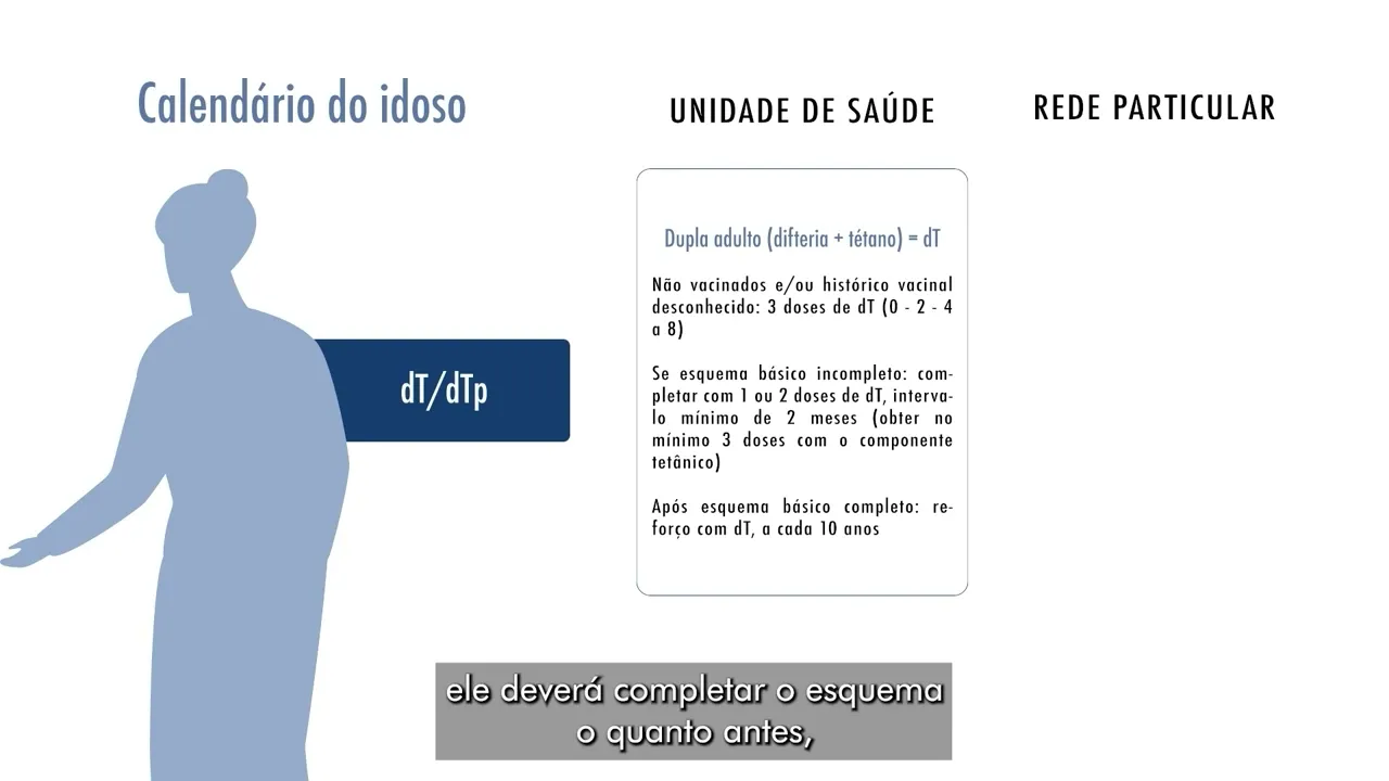 antes respeitando o intervalo mínimo de dois meses entre as doses que faltam após o esquema básico completo esse idoso fará o reforço da vacina DT A cada 10 anos na unidade de saúde já na rede particular a proteção contra o tétano será realizada com a vacina Tríplice bacteriana celular do tipo adulto que combina difeteria tétano e coqueluche a chamada vacina dtpa para idosos não vacinados anteriormente eles devem receber três doses da vacina dtpa no esquema 0 2 4 a 8 se o idoso possui o esquema incompleto da vacina dtpa ele deverá completar o quanto antes