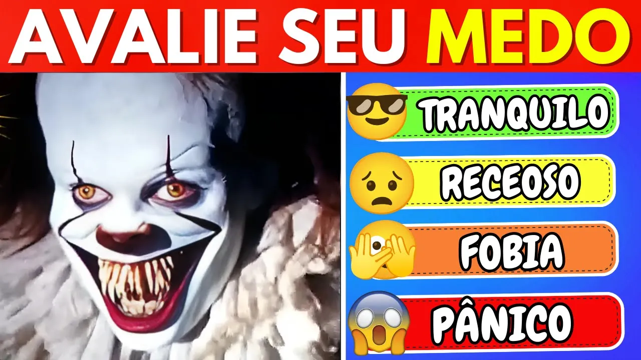 bem-vindo ao canal Zen Quiz hoje preparamos Um Desafio arrepiante para você vamos avaliar 100 tipos de medo desde os mais comuns até os mais bizarros preparado vamos nessa como você avalia o medo de alturas como você avalia o medo de aranhas como você avalia o medo de espaço [Música] fechados como você avalia o medo de Multidões [Música] como você avalia de lugares [Música] escuros como você avalia o medo de [Música] cobras como você avalia o medo de voar [Música] como você avalia o medo de [Música] palhaço como você avalia o medo de trovões e [Música]