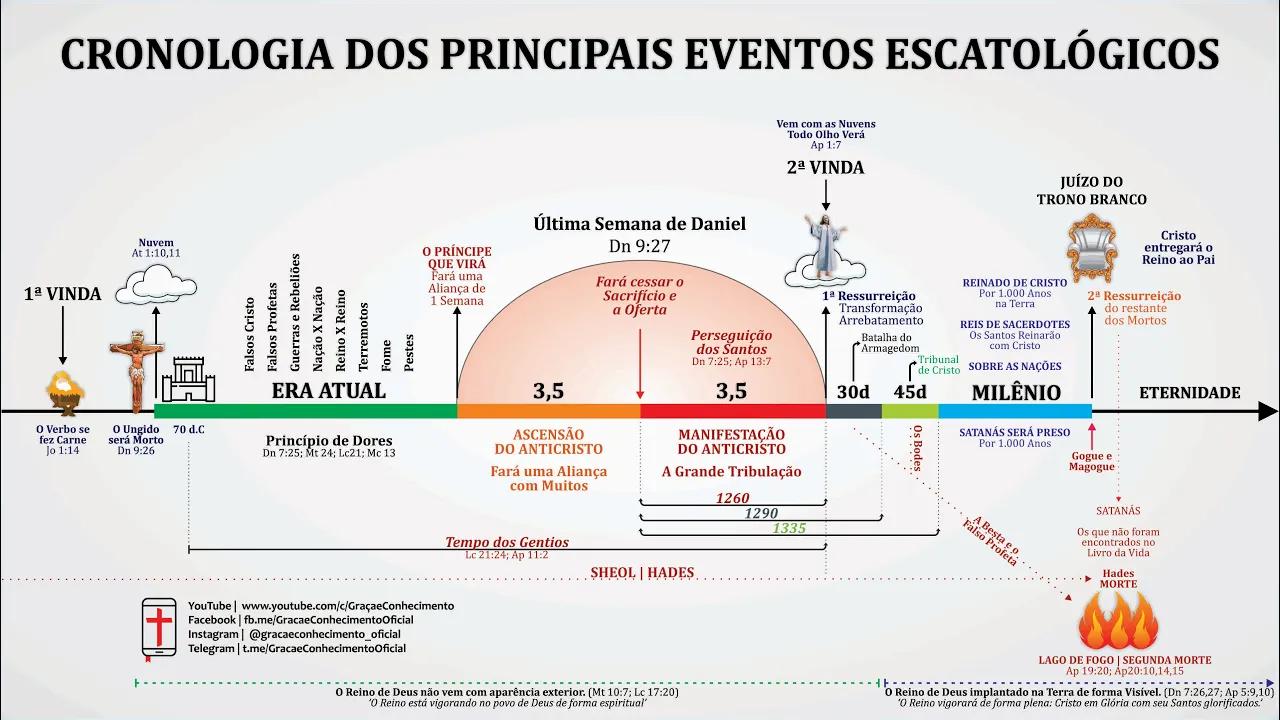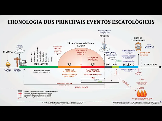 [Música] E aí Oi a paz do Senhor meus irmãos meu nome é Thiago diz do canal graça e conhecimento E hoje nós vamos falar um pouquinho sobre a cronologia dos principais eventos escatológicos quando lemos o autor de Hebreus ele vai falar para nós que da mesma forma que Cristo foi oferecido uma vez para tirar o pecado de muitos ele aparecerá uma Segunda vez não mais para tirar o pecado mas para trazer a salvação aqueles que o aguardam quando olhamos para a palavra de Deus vamos perceber que em toda a escritura está sendo anunciada a primeira