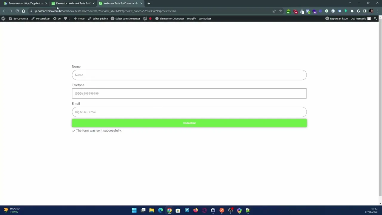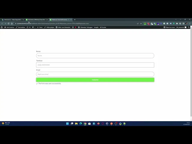 momento essa página aqui ela já está com web Hulk pronto para ser disparado lá para o gosto de conversa só que não é só o fato de eu preencher aqui esse formulário por exemplo pegar um telefone aqui para estar preenchendo agora aqui e vou colocar o e-mail também depois que eu clicar em submete ou cadastrar aqui nesse meu formulário as informações vão ser levadas lá para o bote conversa só que aqui ainda não vai aparecer nada então sempre que você estiver configurando esse webbook você tem que clicar aqui em receber dados tá copiei esse link