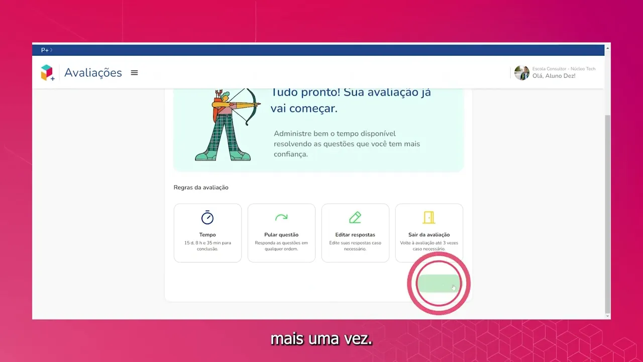 [Música] Oi turma hoje eu vou mostrar como usar o ciclo avaliativo vamos ver se a gente tá afiado no conteúdo do capítulo partiu primeiro entra no p e faz o login rápido e direto depois clia no card do ciclo avaliativo Ali você vai ver as avaliações dos Capítulos agendados das disciplinas de língua portuguesa matemática ou ciências para iniciar é só clicar no agendamento que o prof fez e depois em começar lei as instruções e clique em começar mais uma vez Responda as questões e clique em próxima questão para seguir terminou tudo clique em finalizar a