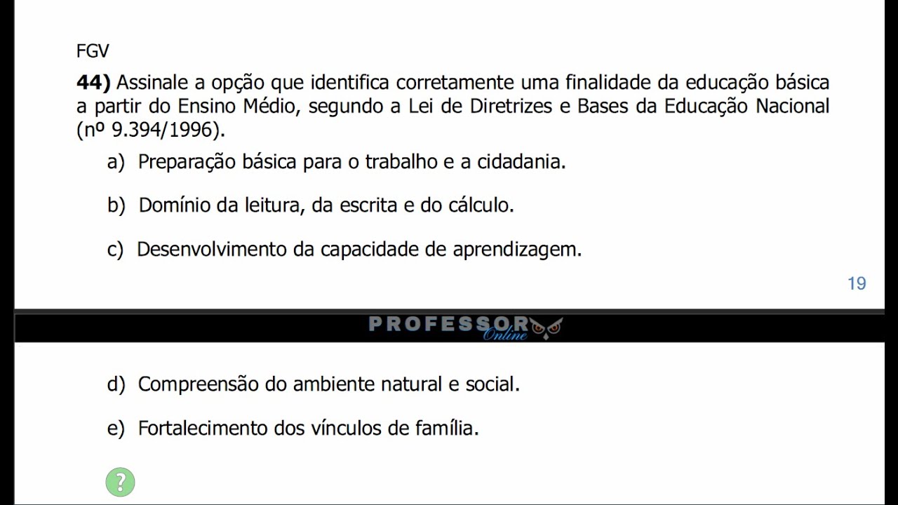 deixa pro final Vai no banheiro Olha só quando tiver uma questão grande assim um pouco mais longa você faz o seguinte você vai ao banheiro Lava o rosto Lava o rosto dá uma uma descansada eí pede perdão para Deus seus pecados Aproveita lá só você e Deus sabe dos seus problemas dos seus bo Artigo 32 o artigo 32 da lei de diretrizes e bases da educação explana que o ensino fundamental obrigatório com duração de 9 anos gratuito na escola pública iniciando aos 6 anos de idade tem por objetivo a formação básica do cidadão mediante mediante