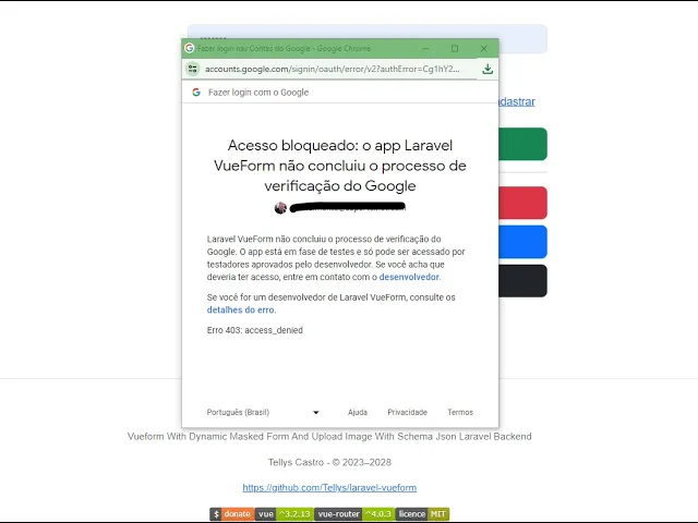 aqui na página e de configuração da da da autenticação aqui né do Serv de autenticação do Google então nessa tela de permissões aqui do off Então a gente vai perceber o seguinte ó ó o nome do aplicativo é esse né então se a gente vier aqui na telinha aqui lá vai conferir vai bater lá ó aplicativo laravel viewform então a gente tá aqui como eu disse na na função de teste na na na opção de teste né o status é teste se tivesse um aplicativo em produção naturalmente ele não daria esse erro então basta para